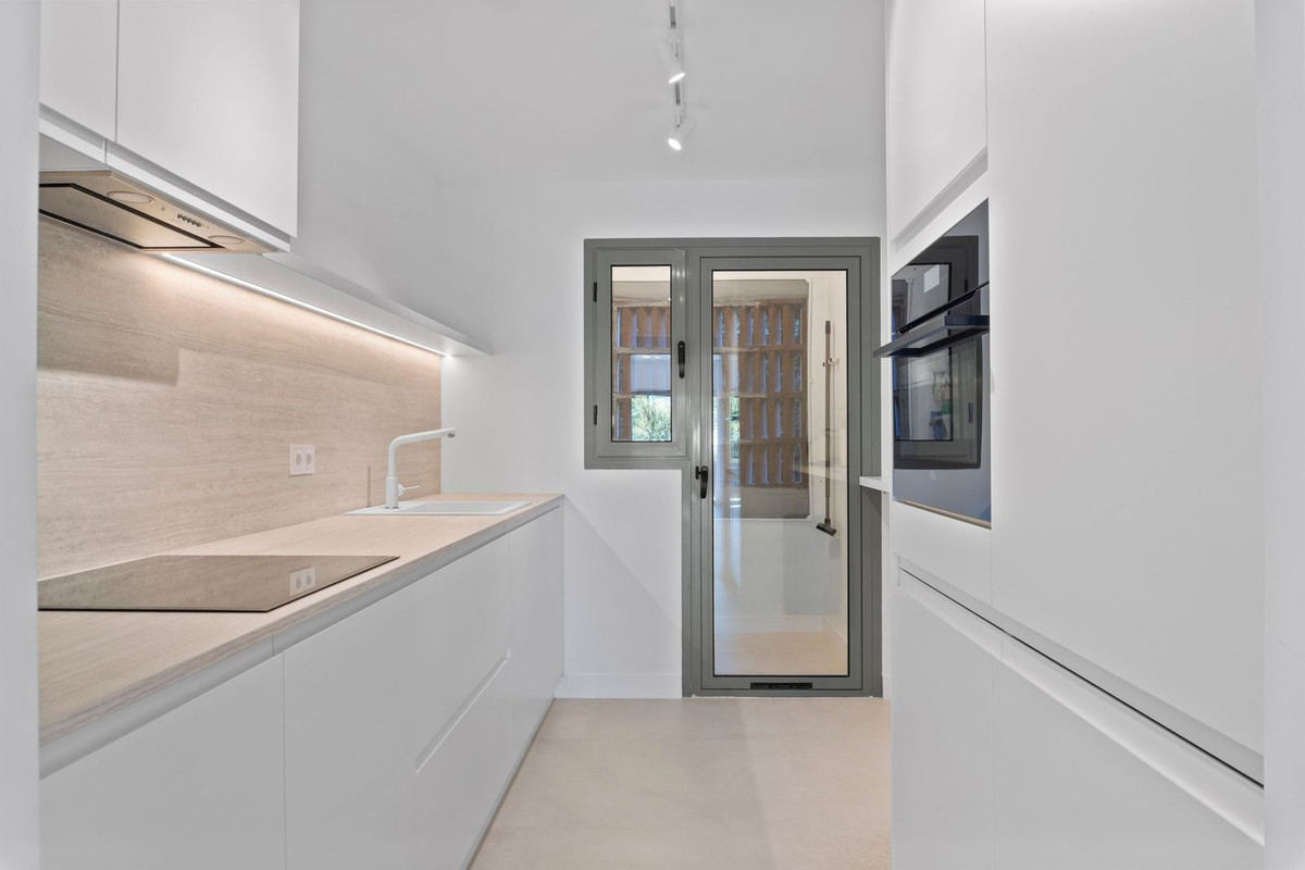 Spanning 135 m² built, this ground-floor exterior apartment (with lift access) features two spacious bedrooms, two modern bathrooms, built-in wardrobes, a storage room, air conditioning, and central heating throughout. The highlight is the expansive south-facing private terrace and garden, providing magnificent panoramic views over the lush golf fairways and sparkling sea – ideal for al fresco dining or relaxation. Recently refurbished to a high standard, it boasts a brand-new quality kitchen, with the option to purchase the furniture for a seamless transition. A secure underground parking space and storage are included in the price.