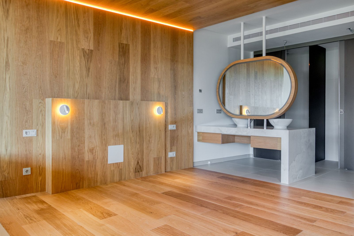 The interior blends sleek modern architecture with warm, high-quality finishes. Floor-to-ceiling windows enhance the sense of space and brightness, creating a fluid connection between indoor and outdoor living.