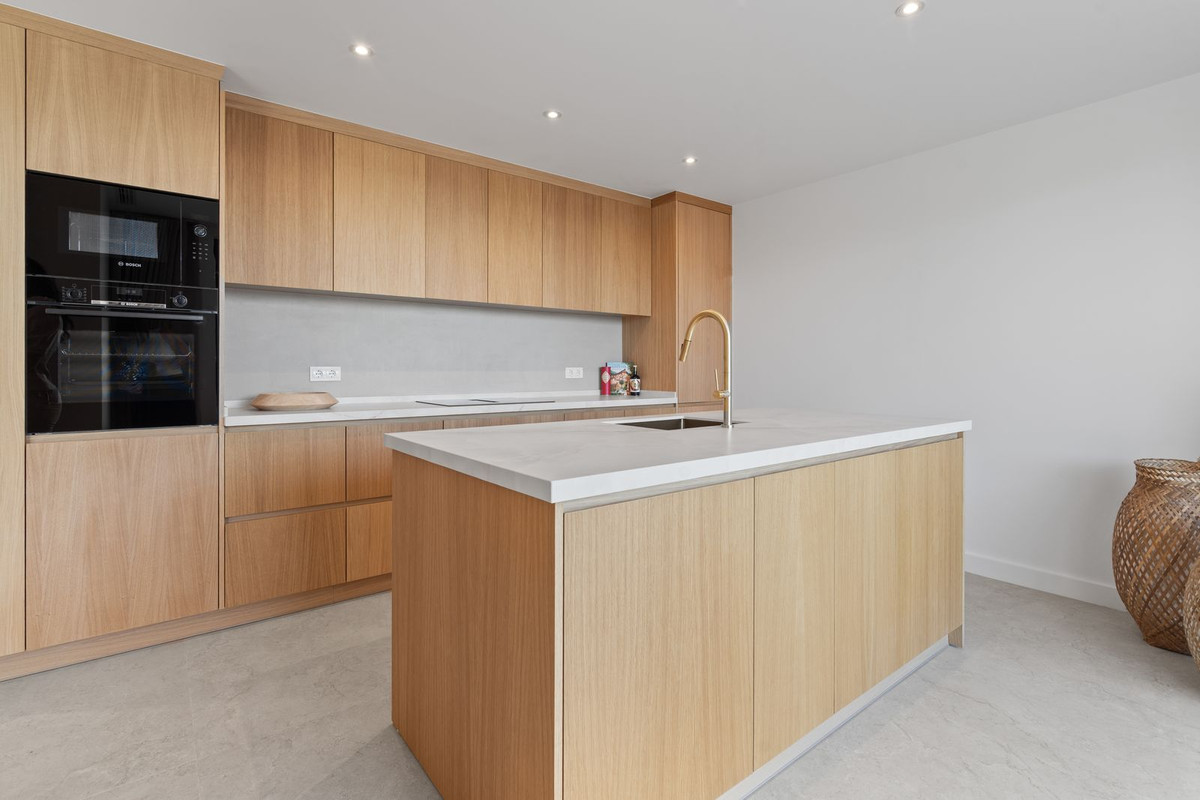The open-plan living and dining area connects seamlessly to a bespoke oak kitchen equipped with high-end Bosch appliances. Large sliding windows create a smooth transition to the outdoor terraces and private swimming pool, allowing for true indoor-outdoor living.