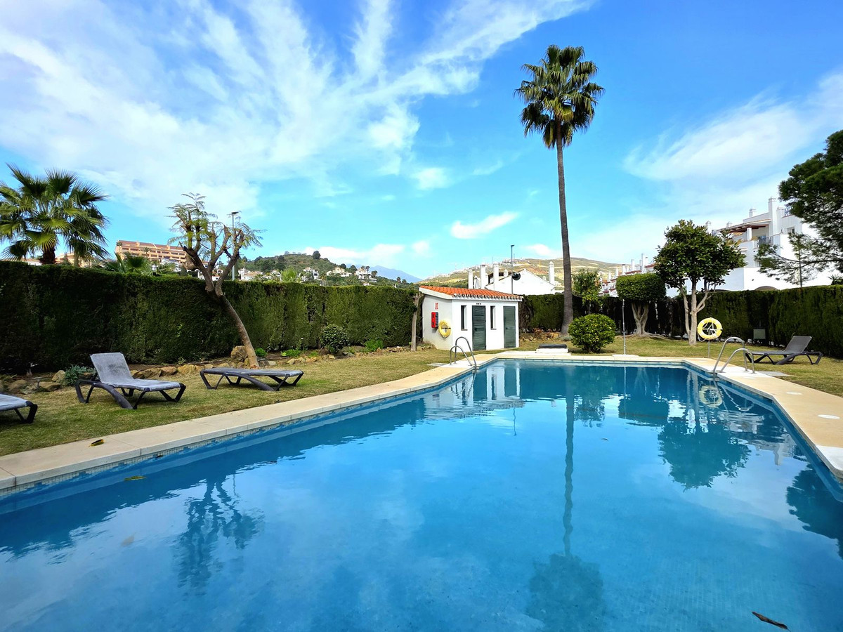 This bargain apartment is located in the highly sought after area of Aloha, Nueva Andalucia, close to schools, golf and amenities. Having a south facing orientation allows this first floor apartment to offer beautiful open views across the golf valley and coastline. This property is well laid out. On entering you are greeted by a hallway with a fully fitted kitchen on the right and a bright sitting room on the left that flows onto the large covered terrace. Being a corner apartment the sitting room has extra windows and plenty of natural light. Both bedrooms are large with built in wardrobes and the master bedroom has A/C. The urbanisation is located at the end of a cul de sac and has a lovely communal swimming pool with sunbeds and gardens. This property is sold with an underground parking space and a storage room.