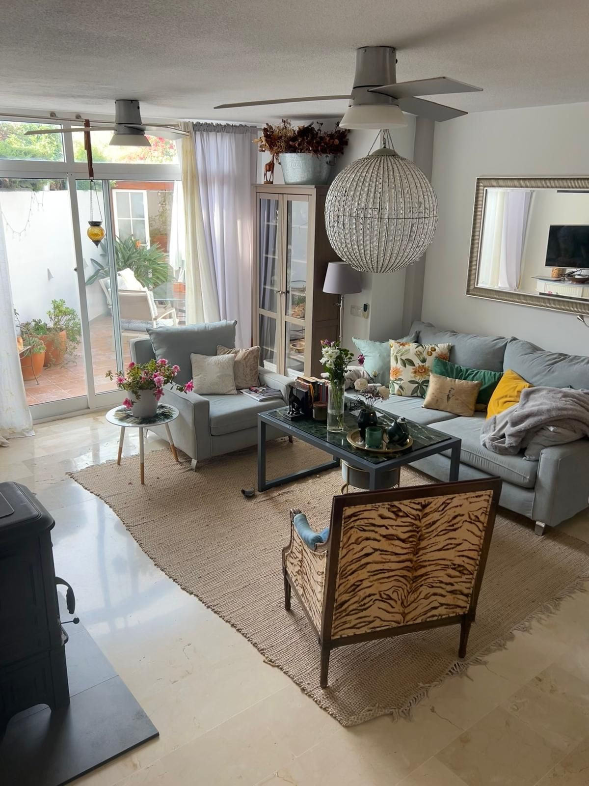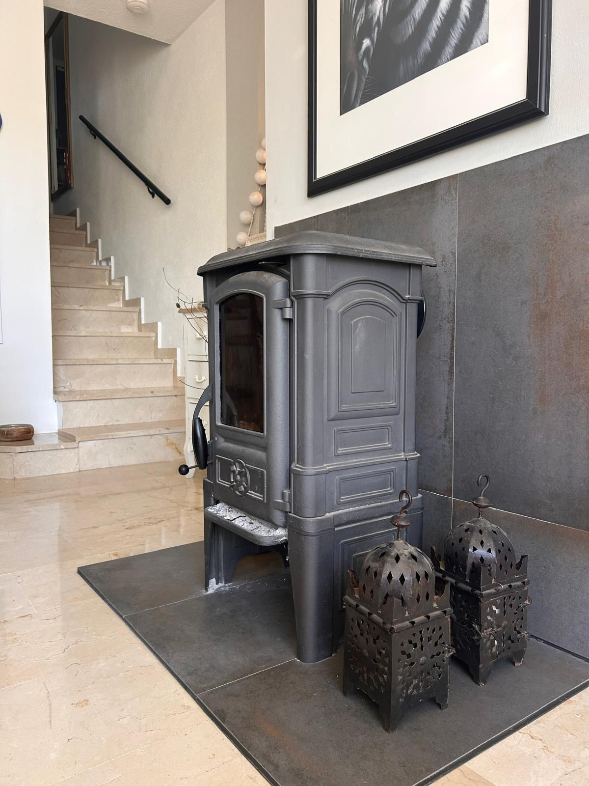 The house is equipped with a cozy fireplace for the cooler months, and a solar panel that ensures energy efficiency. The open kitchen, with a high dining table, creates a social and bright atmosphere, perfect for sharing special moments. Highlights include its beautiful west-facing patio, ideal for enjoying sunsets, and two terraces that provide additional spaces to relax.