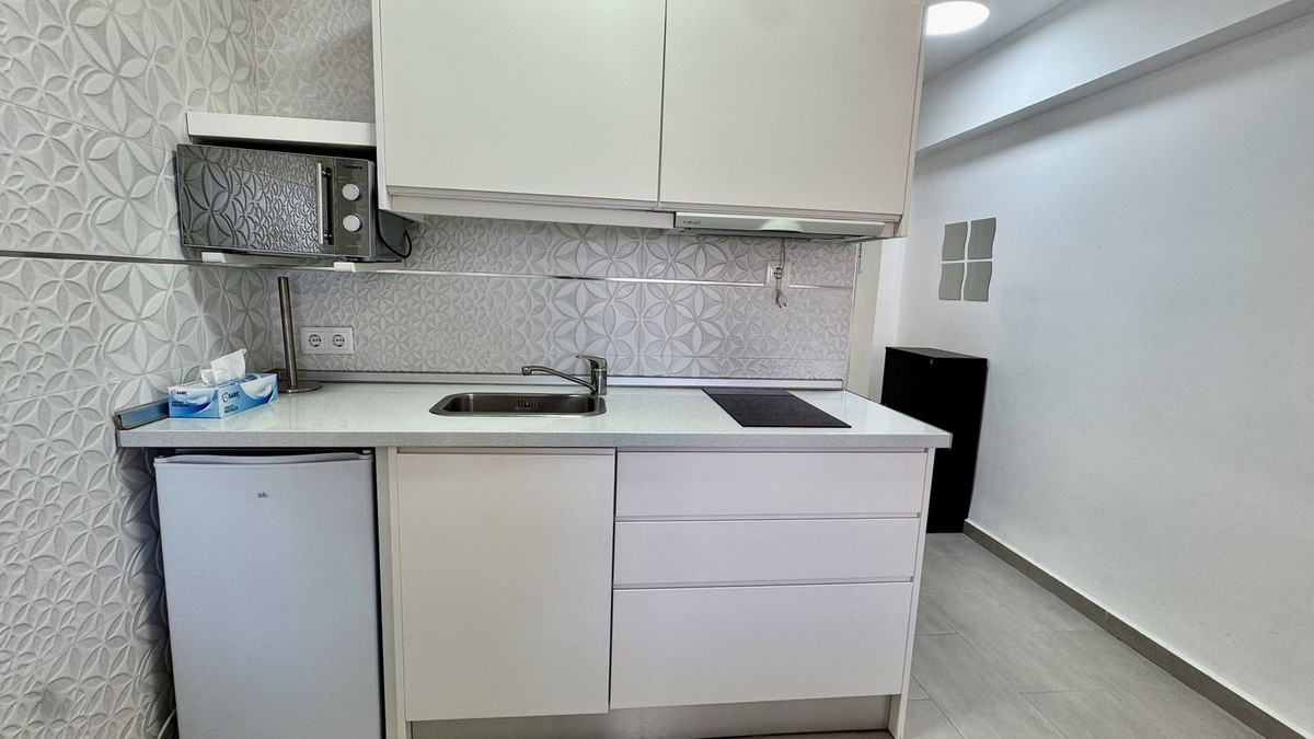 Renovated studio apartment with open plan kitchen, living room, bathroom and covered terrace with stunning sea views, ideal as an investment. The complex has a garden, swimming pool, 24 hour reception and communal parking.