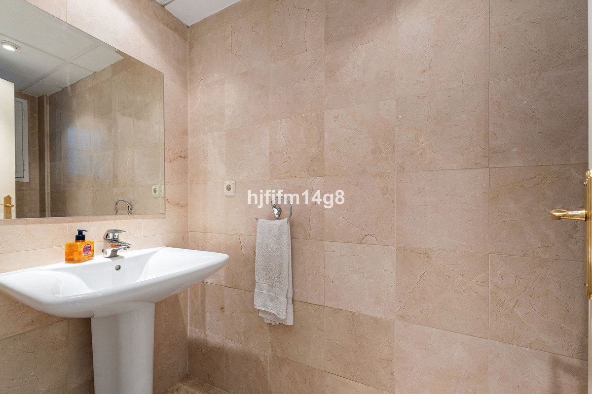 The townhouse is distributed over several levels and offers generous interior and exterior spaces. On the entrance level, you will find a bright and inviting combined living and dining room featuring an open fireplace and direct access to a south-facing terrace, perfect for enjoying Marbella's year-round sunshine. The fully fitted kitchen is practical and well laid out, complemented by an entrance hall, storage room and a guest toilet on this level.