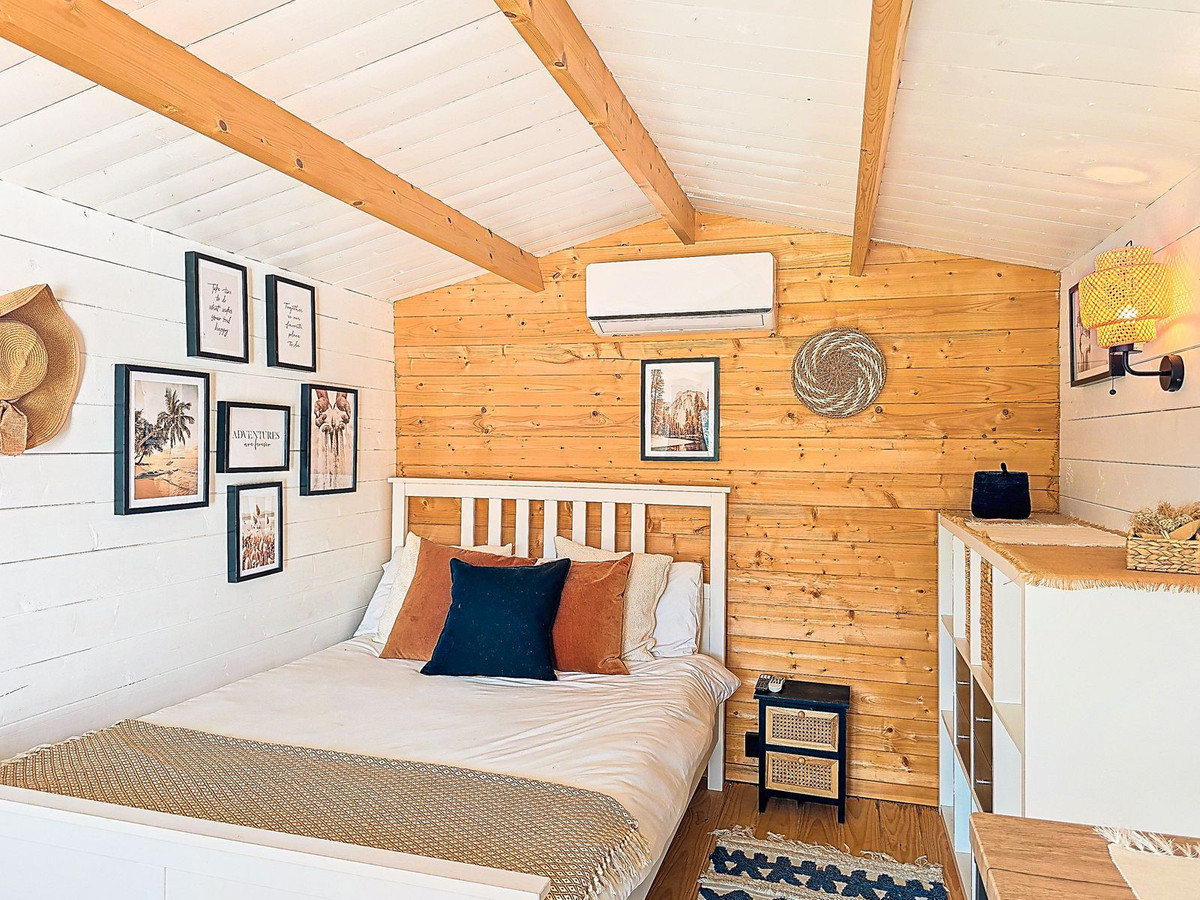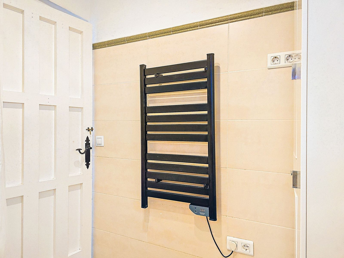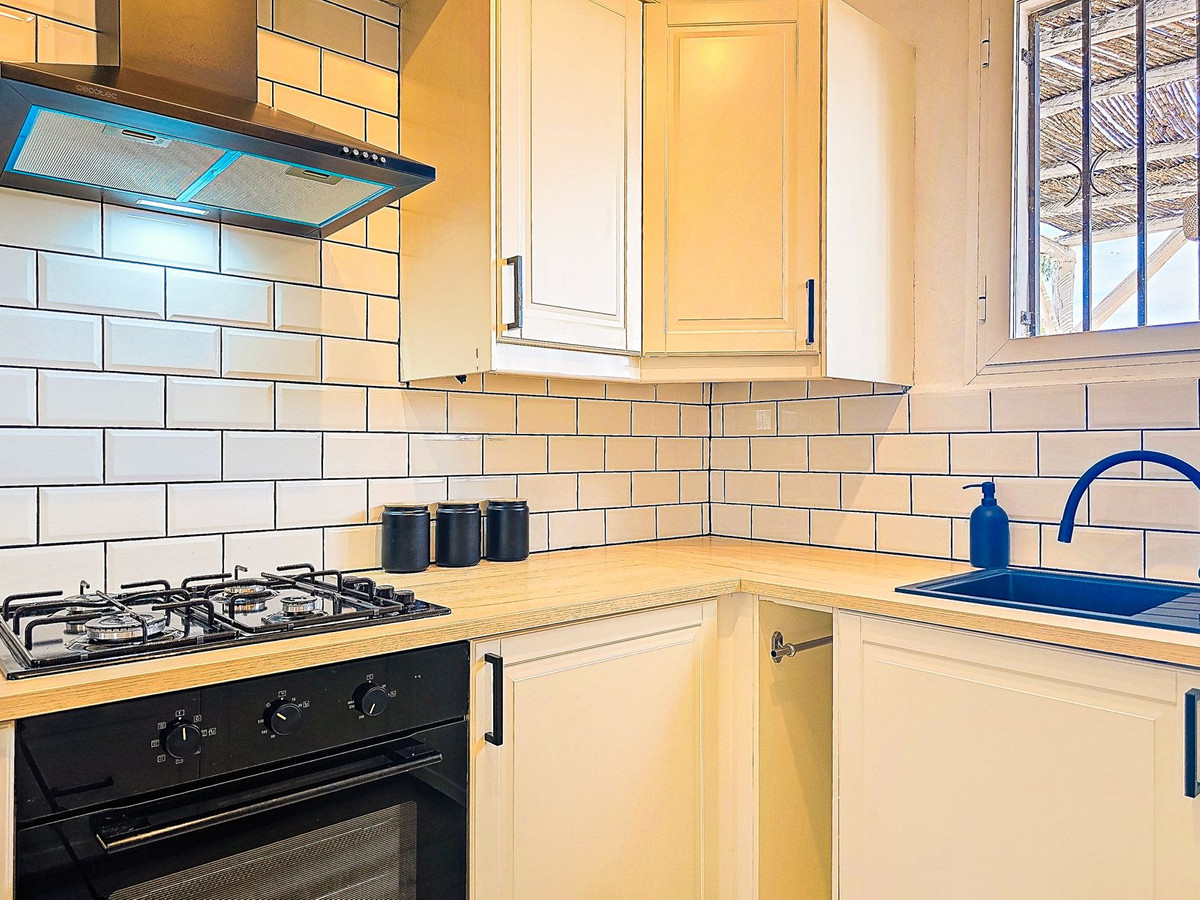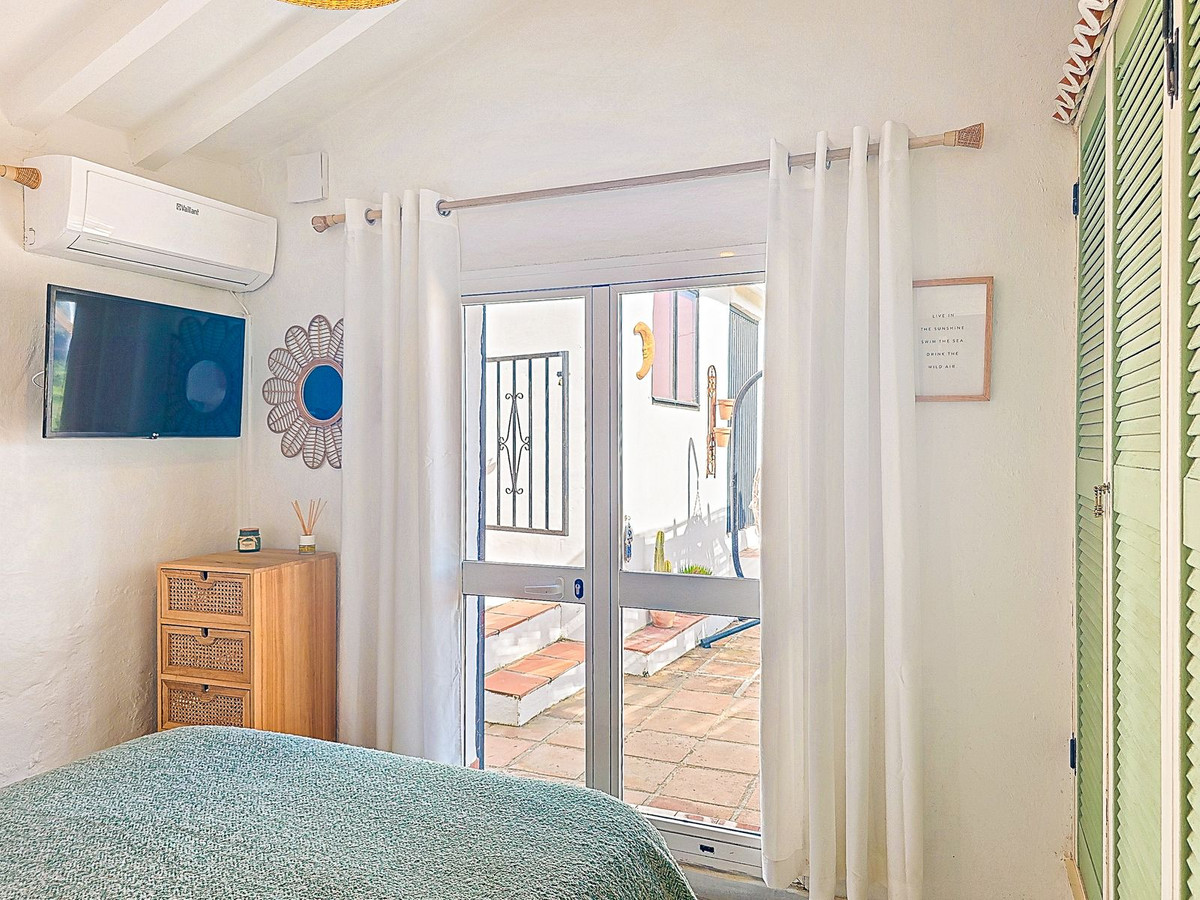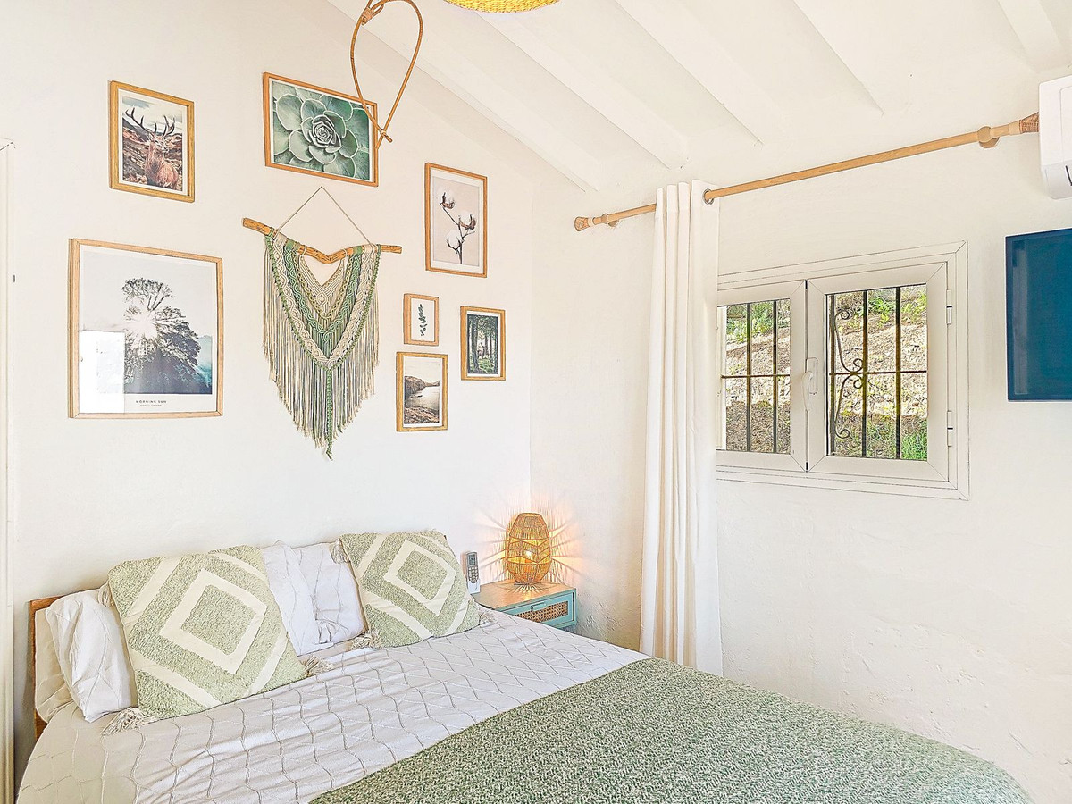 Additional features include air conditioning and heating throughout, wood-burning stoves, double-glazed windows, built-in wardrobes, private parking, a tourist licence, a private water depósito with share in Patamalara, a septic tank, and easy access from the main Torrox to Cómpeta road. The beautifully maintained garden is planted with olive and fruit trees, enhancing the authentic Mediterranean charm.