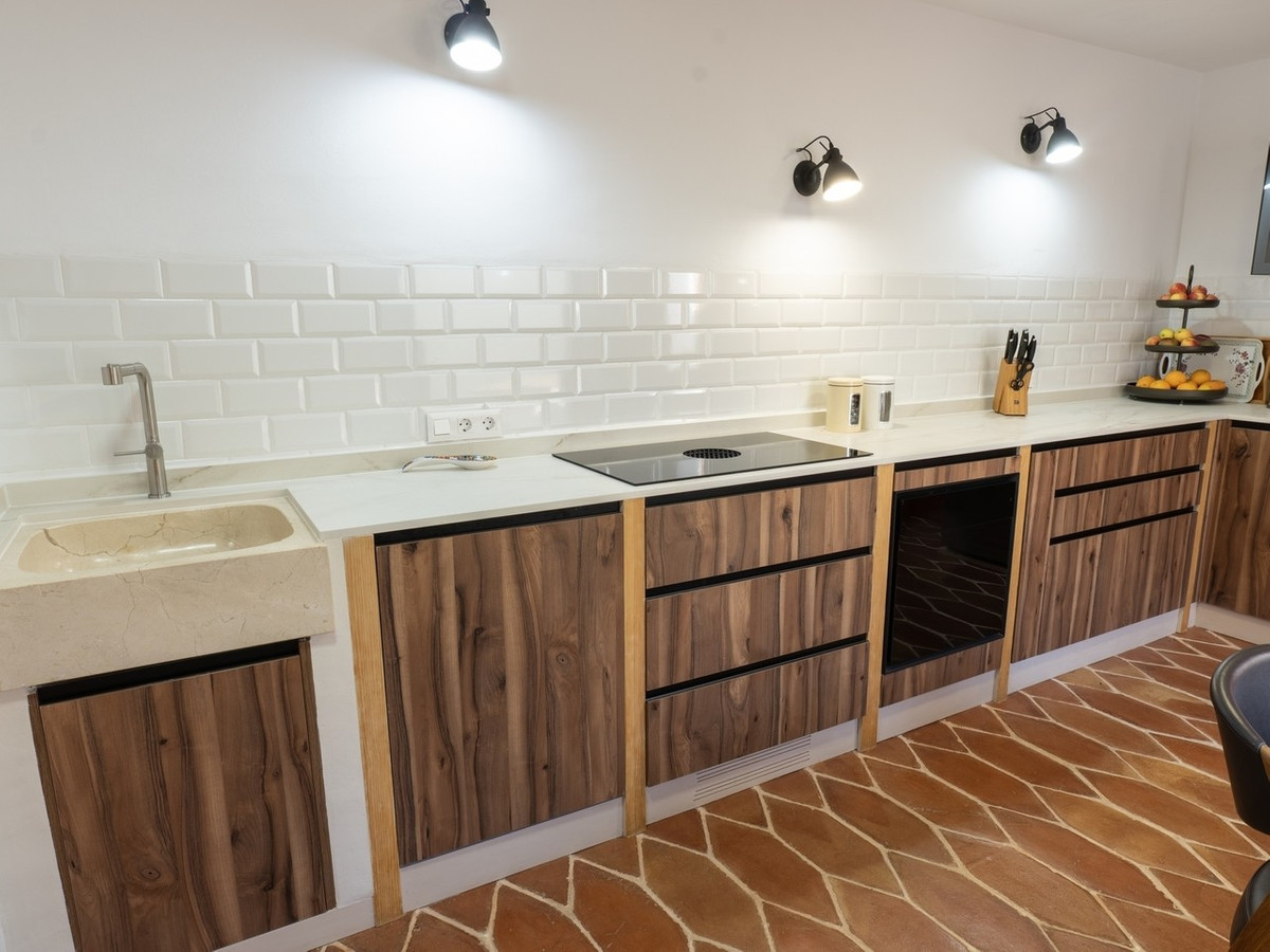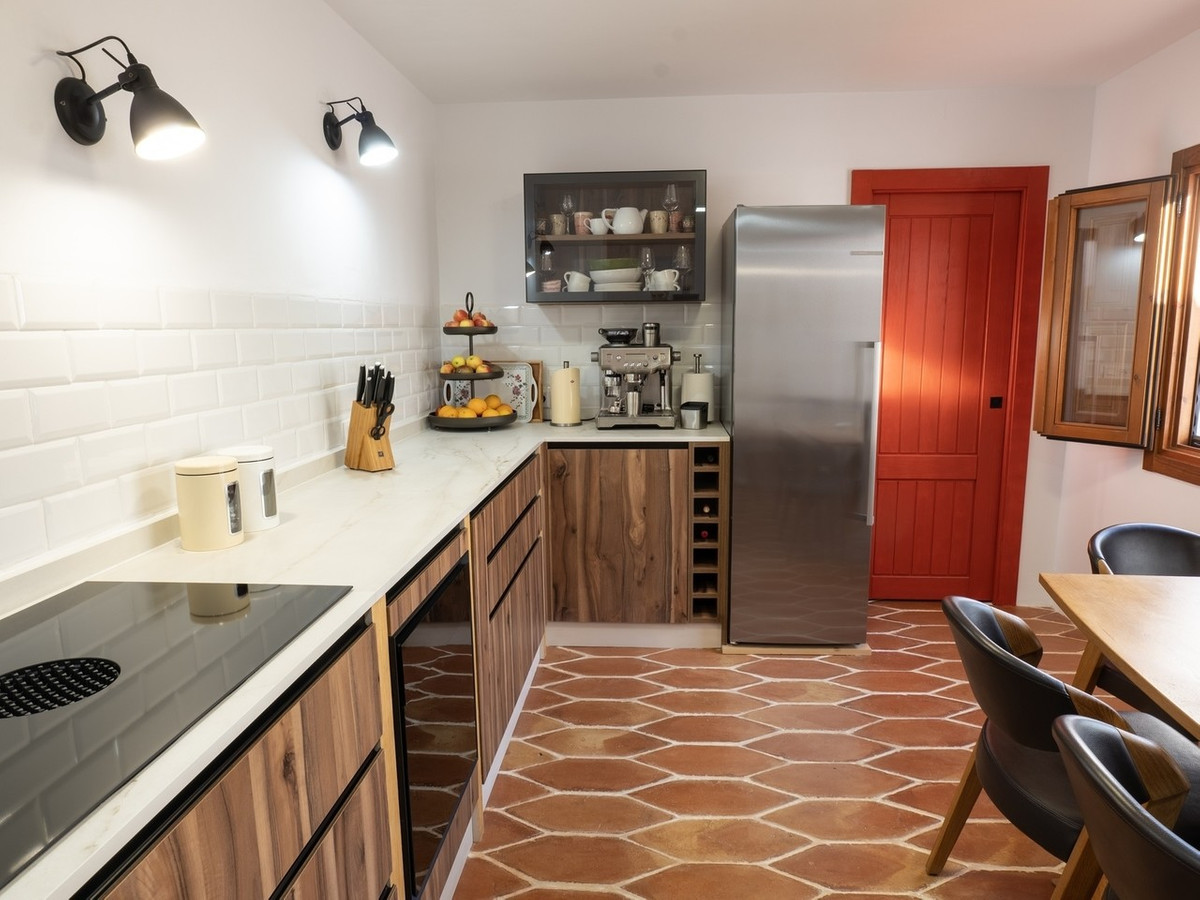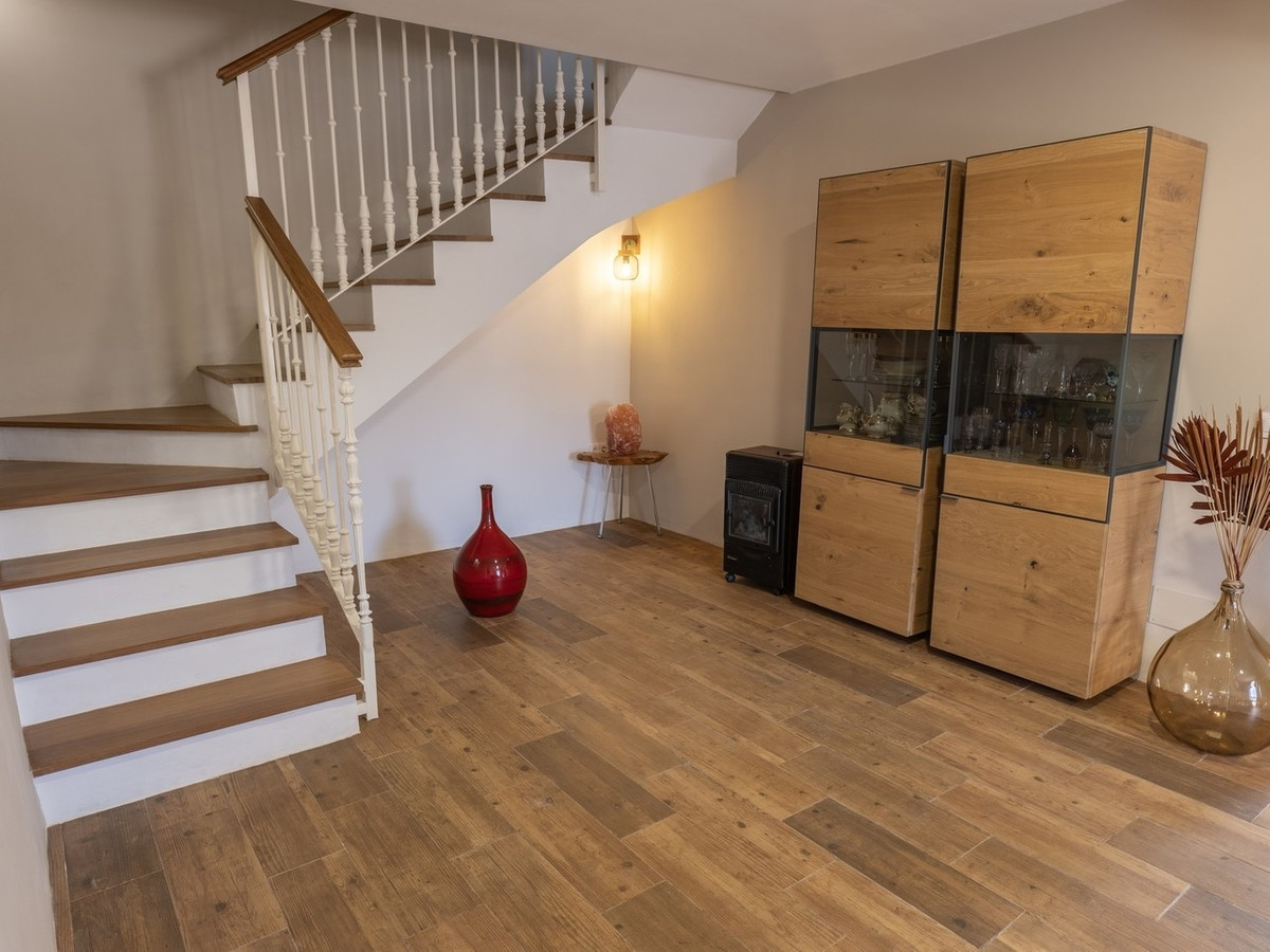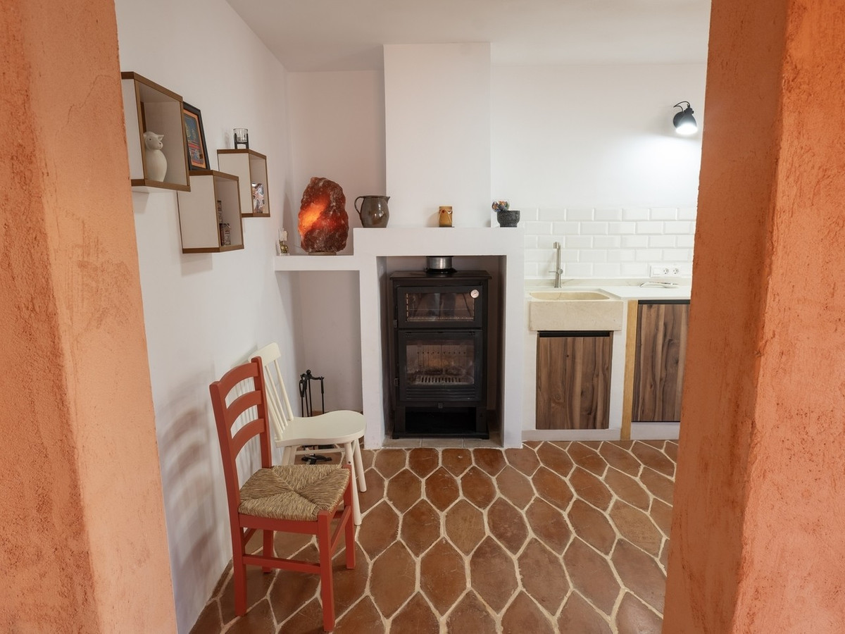 The solid iroko wood main door and double-glazed wooden windows combine elegance with thermal comfort, while the large front porch provides natural shade and ventilation throughout the year. Inside, the entrance hall preserves its original mud-brick walls coated with natural mortar, ensuring freshness and durability. The kitchen is fitted with quality appliances, a traditional oven-fireplace, a separate pantry, and a fitted design that blends practicality with style. The living room offers distinct areas for dining and relaxation, complemented by two bedrooms and a full bathroom on the ground floor.