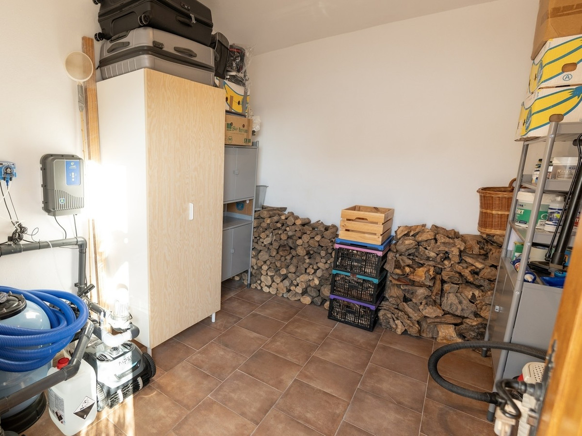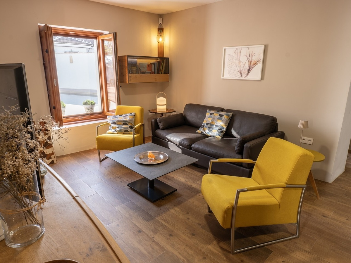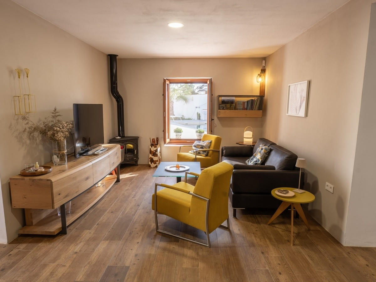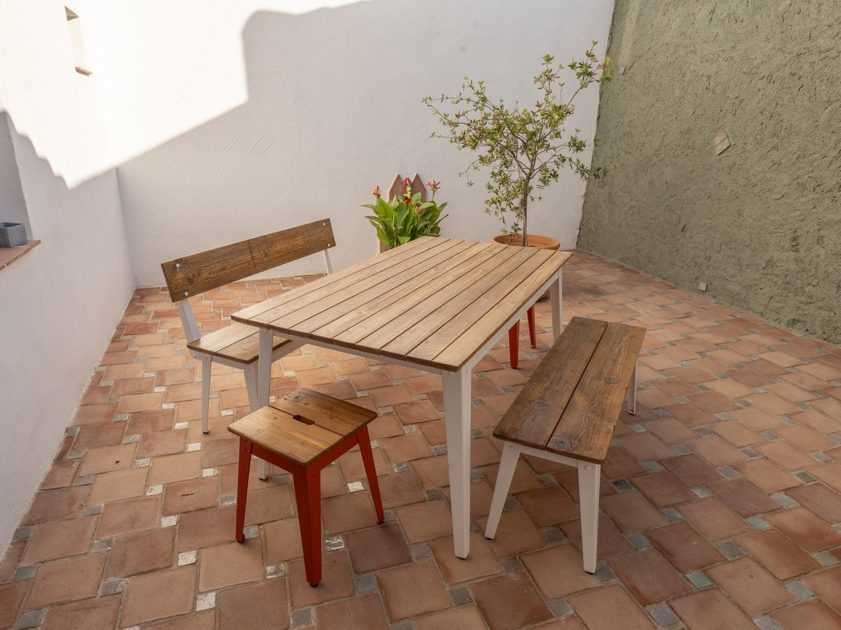 The solid iroko wood main door and double-glazed wooden windows combine elegance with thermal comfort, while the large front porch provides natural shade and ventilation throughout the year. Inside, the entrance hall preserves its original mud-brick walls coated with natural mortar, ensuring freshness and durability. The kitchen is fitted with quality appliances, a traditional oven-fireplace, a separate pantry, and a fitted design that blends practicality with style. The living room offers distinct areas for dining and relaxation, complemented by two bedrooms and a full bathroom on the ground floor.