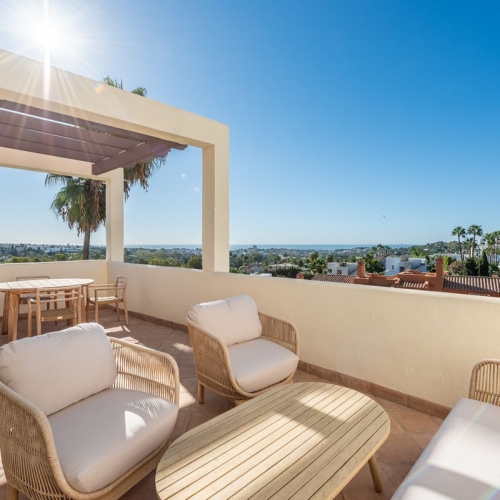 We are pleased to present this exceptional corner apartment, perfectly situated in one of the most strategic and sought-after locations in Nueva Andalucía. Located on the first floor with a bright Southeast orientation, this property stands out for its natural light and its privileged position within a prestigious gated community.