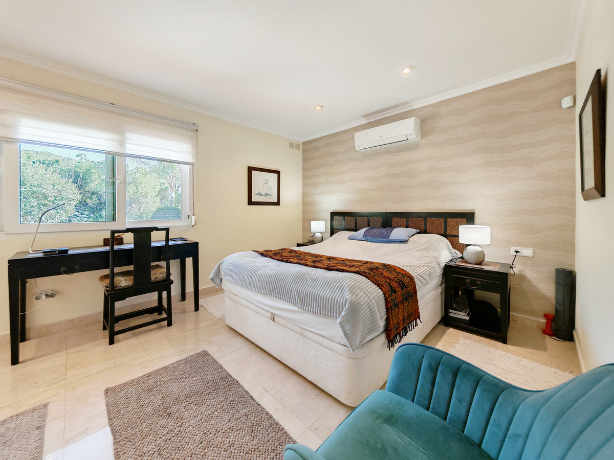 Villa for sale in Elviria, Marbella with 3 bedrooms, 3 bathrooms and with orientation south, with private swimming pool, private garage and private garden. Regarding property dimensions, it has 219 m² built and 1,061 m² plot. Has the following facilities amenities near, transport near, air conditioning, partly furnished, fully fitted kitchen, utility room, fireplace, double glazing, barbecue, living room, water tank, sea view, covered terrace, fitted wardrobes, garden view, panoramic view, underfloor heating (bathrooms), close to sea / beach, close to golf, excellent condition, close to shops, close to schools, pets allowed and roof terrace.
