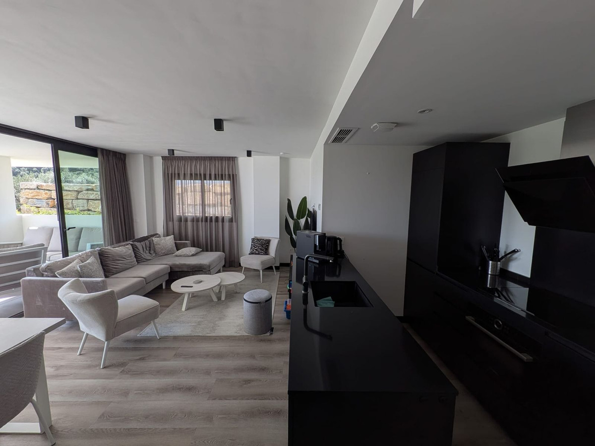 Built in 2023 and presented in excellent condition, the apartment features three bedrooms and two bathrooms, with a bright and exceptionally spacious living area that flows directly onto expansive terraces. The southwest orientation ensures abundant natural light throughout the day, while panoramic views stretch across the Mediterranean Sea, the mountains, and the beautifully landscaped gardens and pool areas.