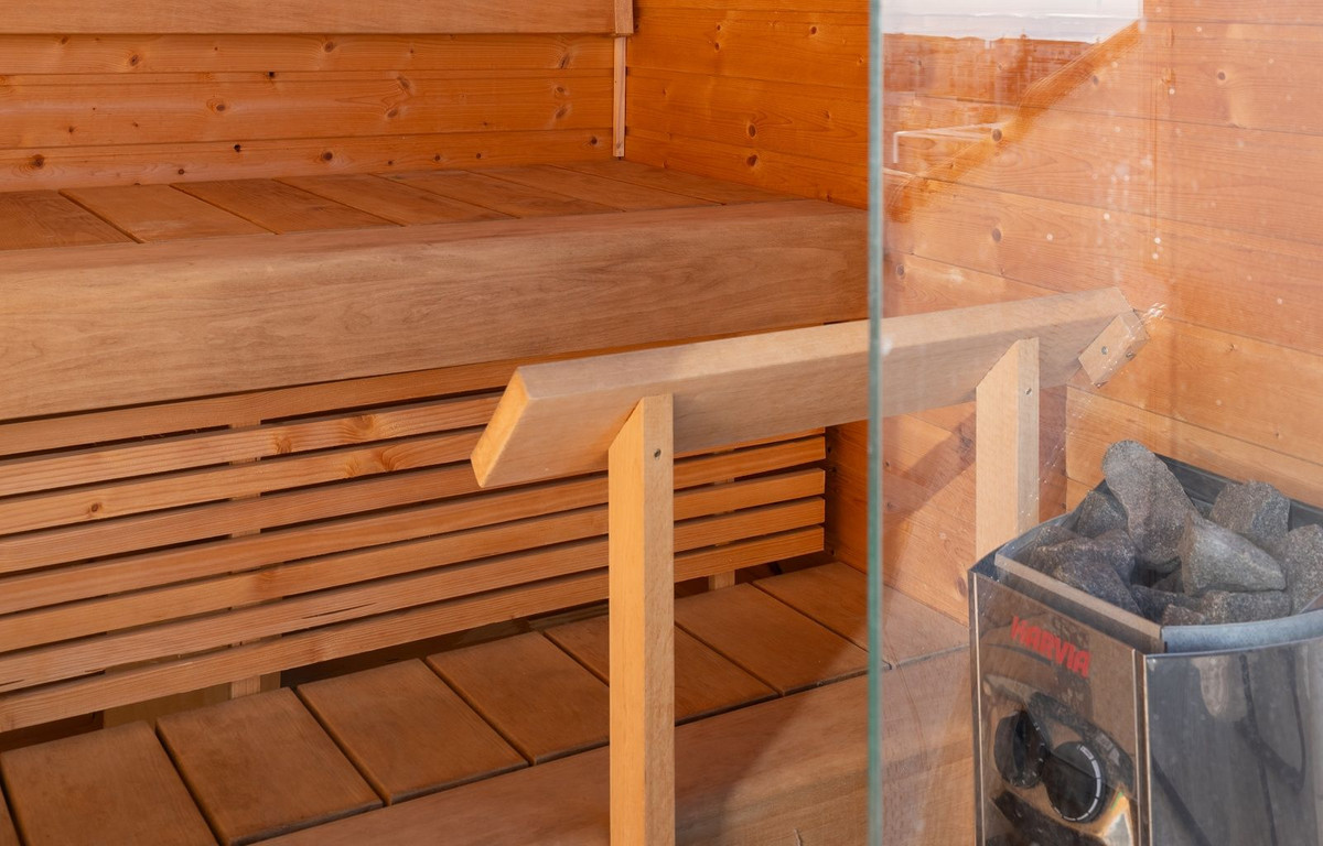 The property is built over three levels, plus a solarium featuring a jacuzzi and Finnish sauna. The open-plan living area connects directly to a private terrace and small garden, creating a bright and inviting indoor-outdoor living space. The modern, fully fitted kitchen is open-plan and includes a breakfast bar.
