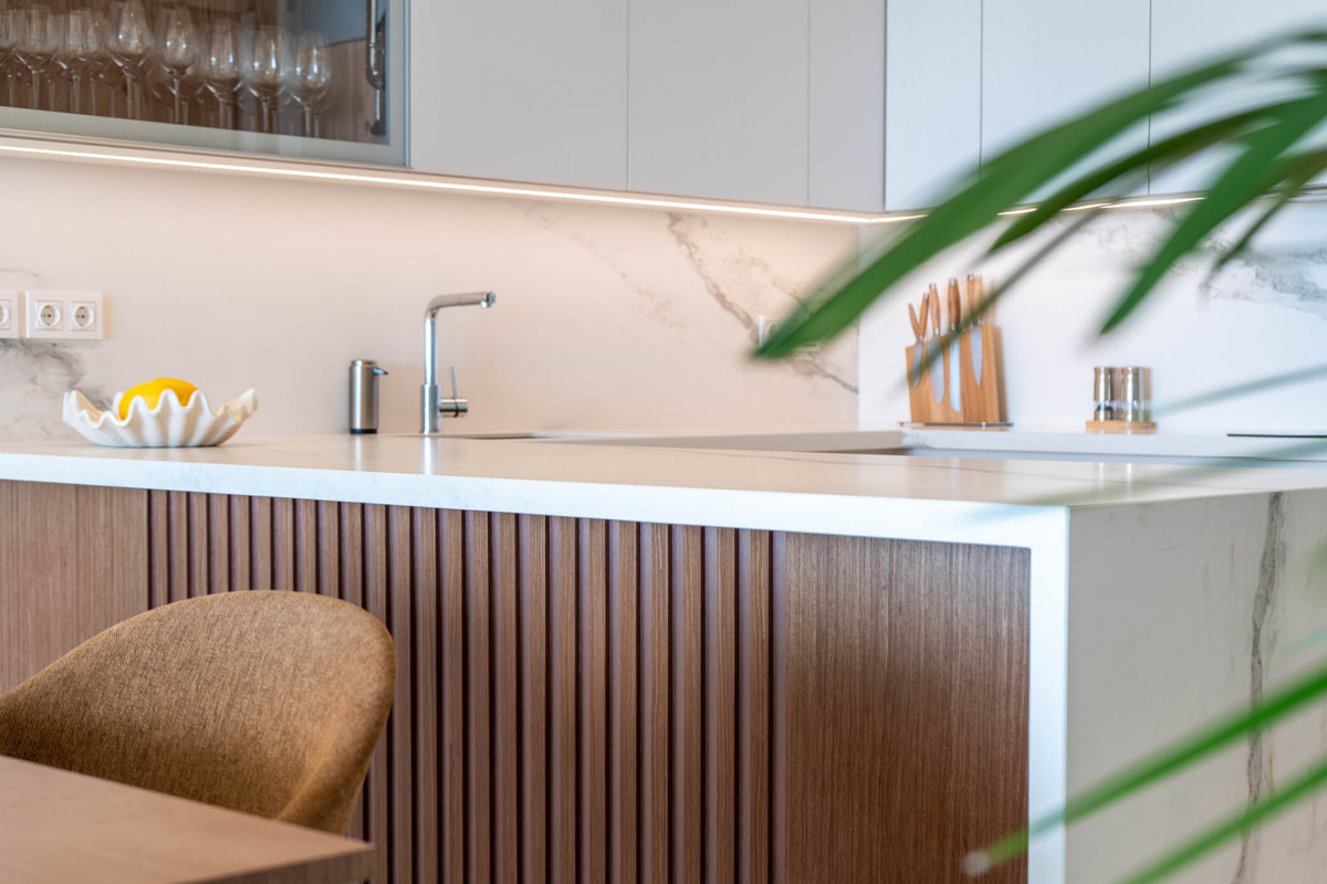 The kitchen is a fully equipped designer installation by Gunni & Trentino, featuring high-quality appliances and contemporary cabinetry conceived for both daily living and entertaining. Clean architectural lines and integrated finishes reinforce the aesthetic consistency of the residence.