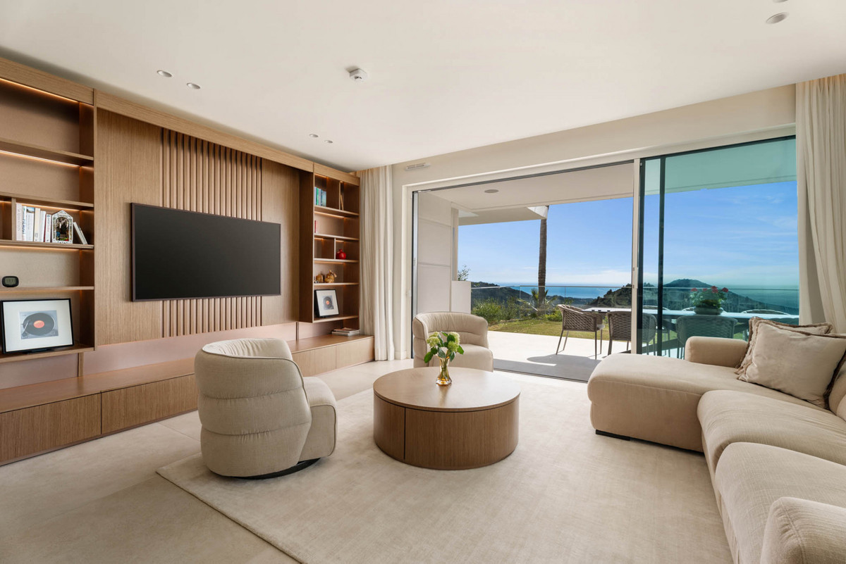 The open-plan living and dining area connects directly to the covered terrace through floor-to-ceiling sliding doors, creating a fluid transition between interior and exterior spaces. The terrace functions as an outdoor lounge and dining area, overlooking the private garden and the Mediterranean horizon beyond. Integrated sound throughout the living room and terrace enhances the indoor–outdoor living experience, while the orientation captures natural light throughout the day and maintains comfort and shade.