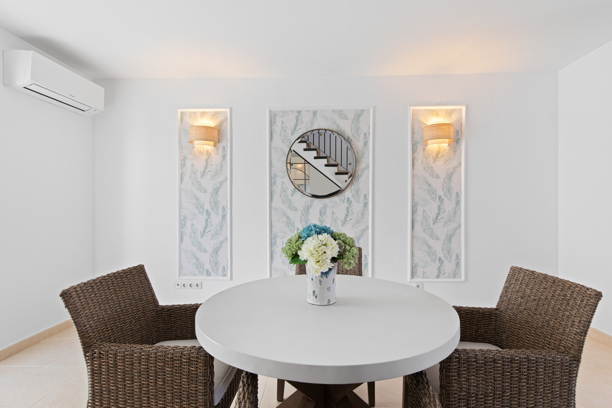 The property combines modern living with charming traditional touches to create a comfortable and welcoming home. A private courtyard patio greets you as you enter through the gate. On the ground floor, there is a spacious living and dining area filled with natural light, along with a fully modernised urban-chic kitchen. From here, you can step out onto a covered terrace with incredible views over the golf course — a lovely spot for outdoor dining or relaxing.