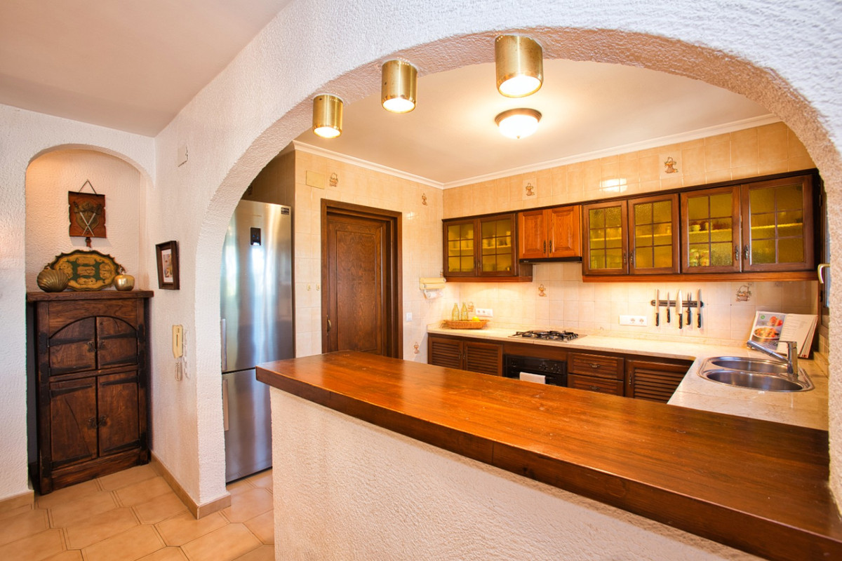 This villa for sale in Benissa is located on an almost flat and fully fenced plot in the residential area of San Jaime. The property faces southwest and offers sea views and views of the Peñon de Ifach from the pool terrace. Apart from a few steps at the entrance, the property is on one level.