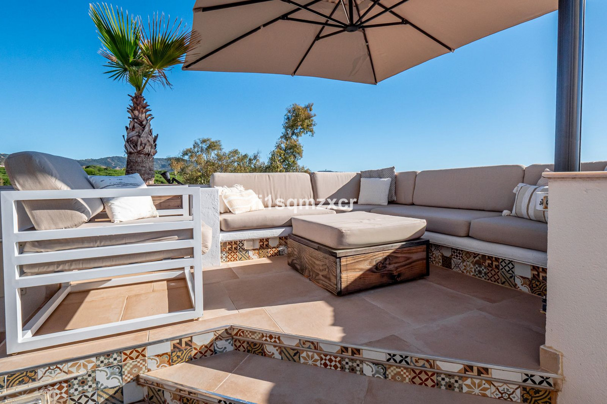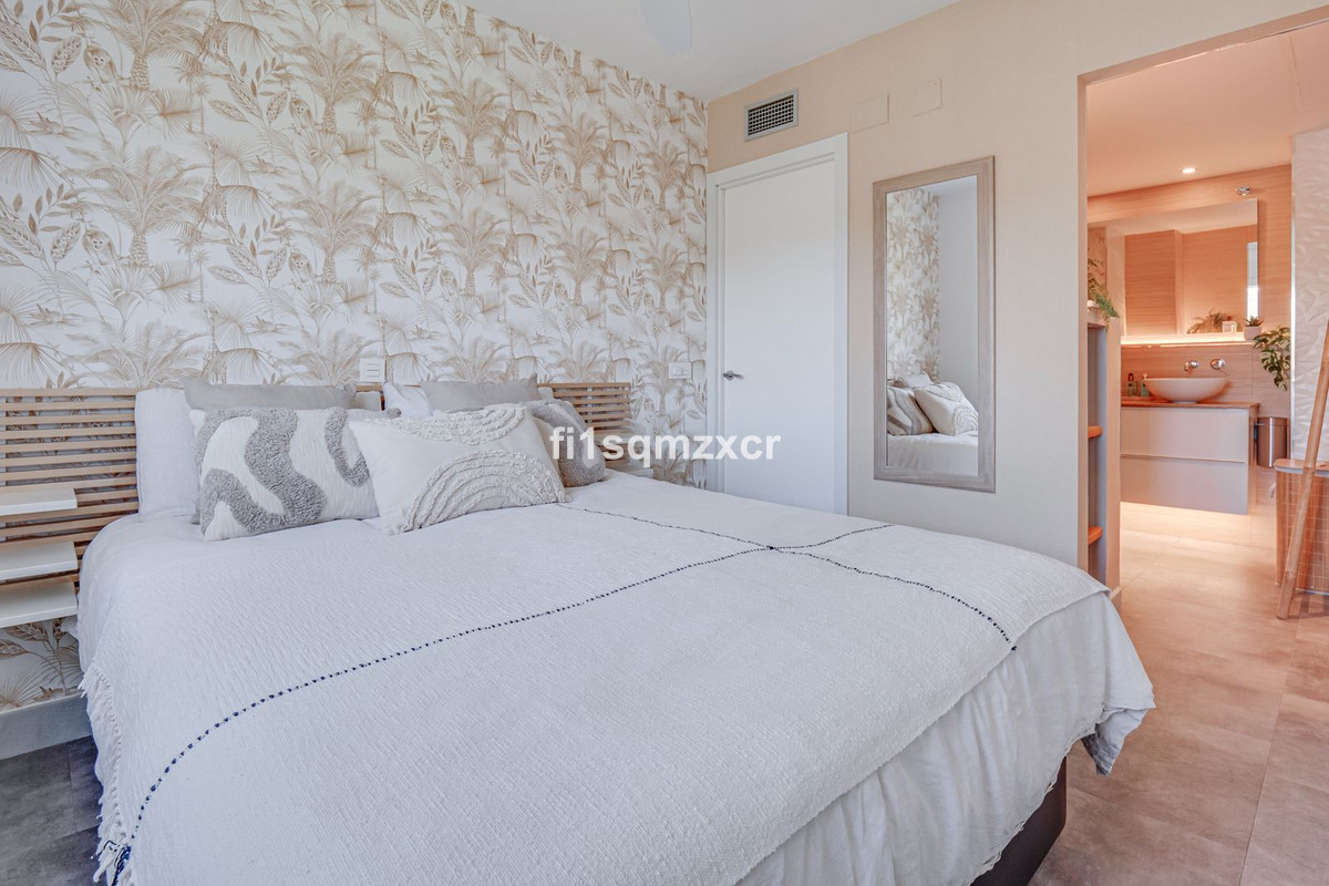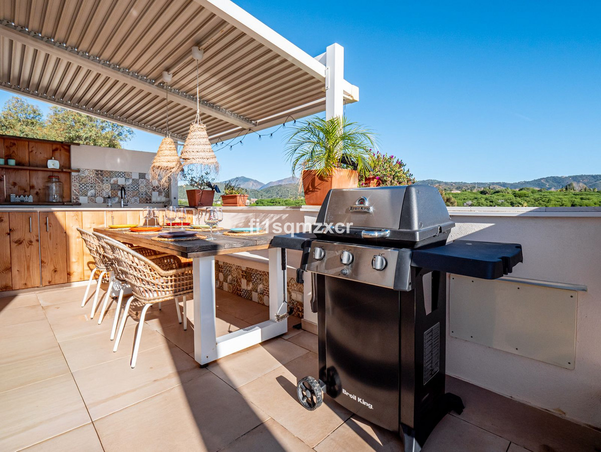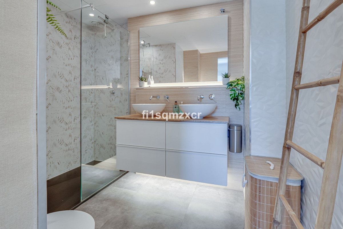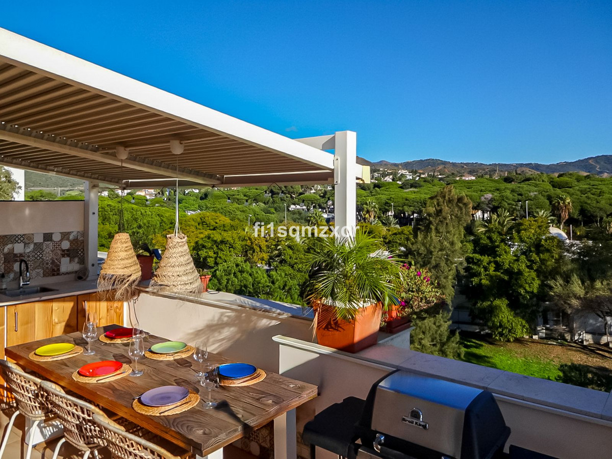 This unique corner penthouse with extraordinary views is located just a few minutes' walk from one of Marbella's most beautiful beaches, home to the best beach clubs, chiringuitos, and beach restaurants. The property has been completely redesigned and modernized with the finest materials. From the entire property, you have spectacular views of the entire coastline, Africa, and the mountains. Fourth floor: Hallway/entrance with stairs to the upper floor, guest toilet, new modern kitchen with a bar and high-quality appliances, a TV corner with a wood-burning stove for romantic evenings, a large L-shaped dining area with panoramic views, a bedroom, and a spacious bathroom.
