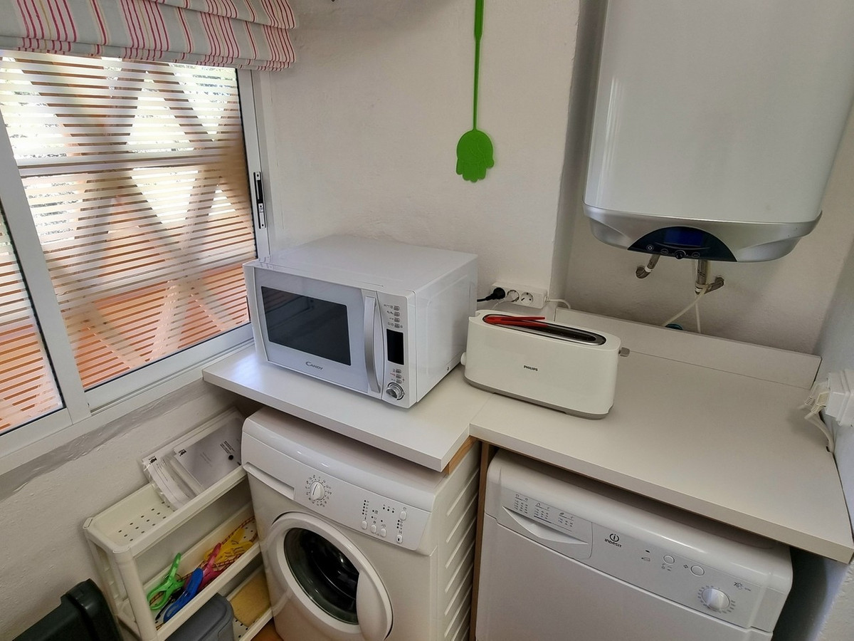Inside, the layout is bright and practical, with a fully fitted kitchen that was renovated just two and a half years ago. It includes a separate utility room housing the boiler, washing machine and a tumble dryer for added convenience. The spacious lounge easily accommodates a large sofa, dining table and storage units, while air conditioning ensures comfort throughout the year.
