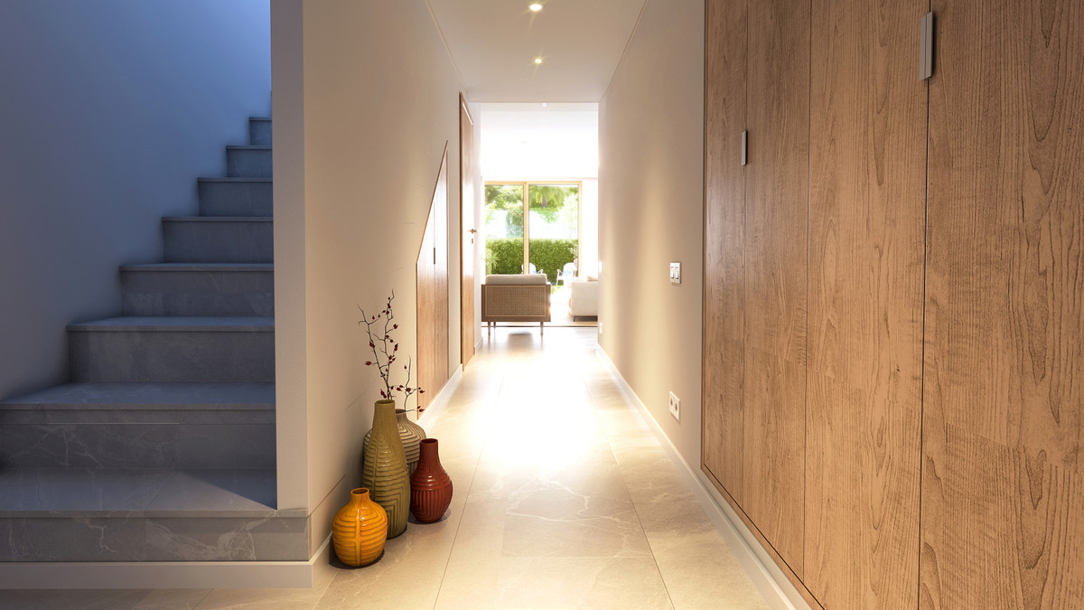 The flooring throughout the homes is a large format ceramic tile by Saloni, with the same tile in its non-slip version for the terraces.