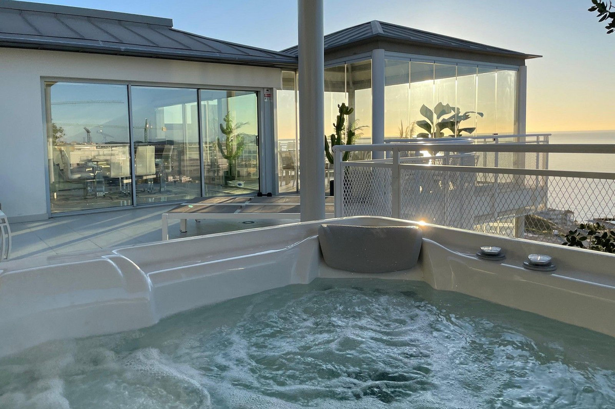 From a covered entrance, beside the elevator, with views of the Sierra Nevada mountains and the Mediterranean sea, you enter this opulent penthouse through a bespoke steel and glass covered vestibule between 2 security doors leading to an internal entrance with a powder room.