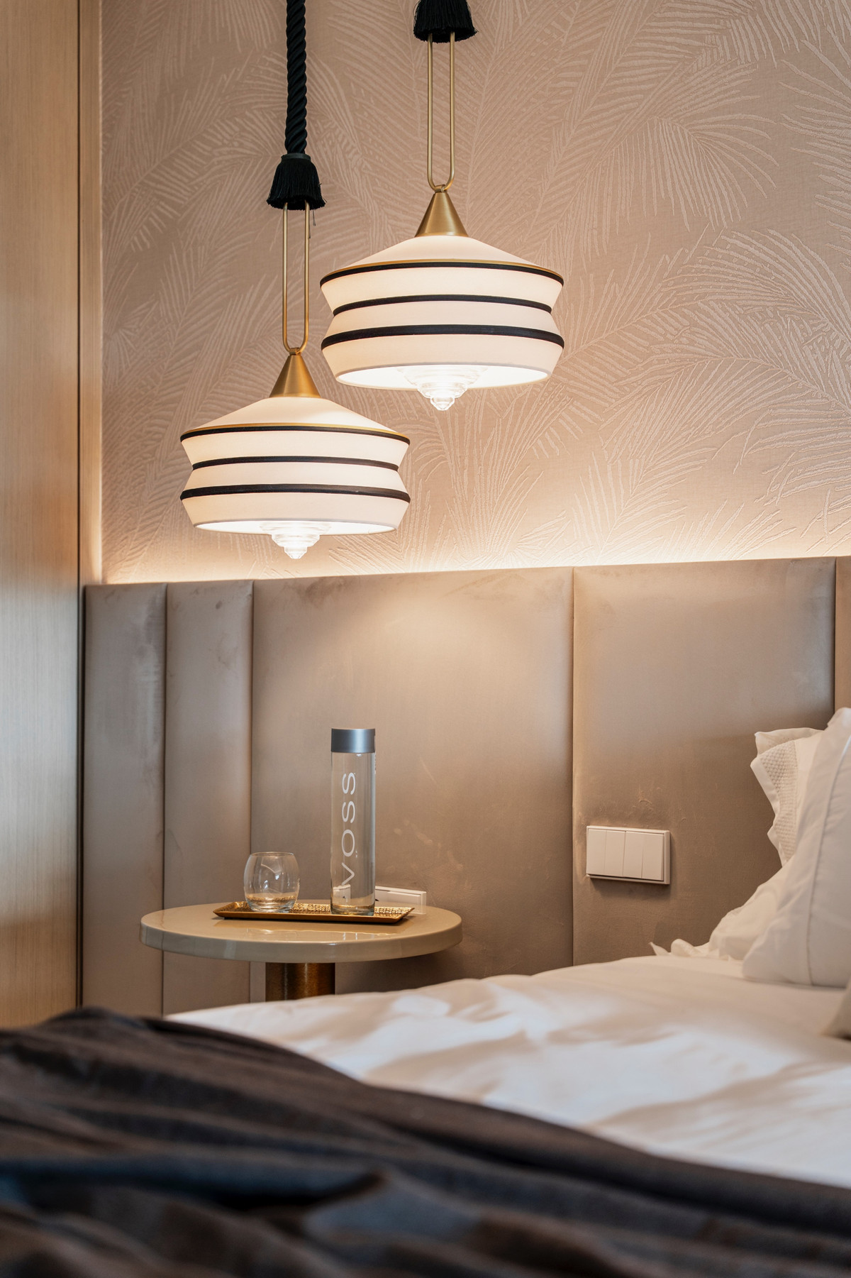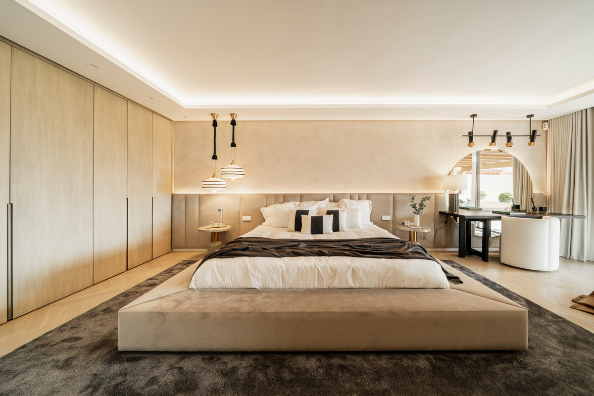 The penthouse offers three spacious en-suite bedrooms, each designed with serene Mediterranean tones for a calming retreat. The master bedroom boasts a generous walk-in closet, providing ample storage and a luxurious dressing experience.