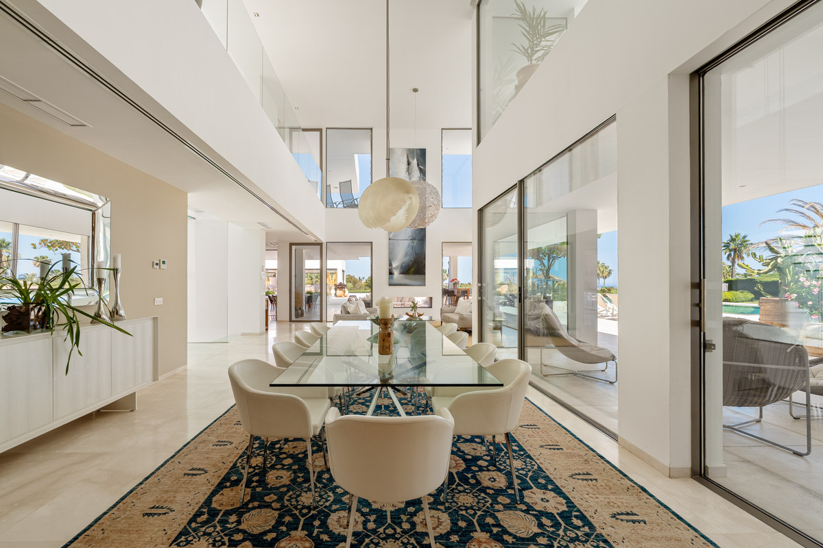 Stunning contemporary villa located in the prestigious neighbourhood of La Cerquilla, nestled in the heart of Nueva Andalucía's Golf Valley. This exclusive seven bedroom residence offers exceptional privacy and breathtaking panoramic views of Marbella's iconic La Concha mountain and the Mediterranean coastline. With its prime location near top golf courses, international schools, upscale restaurants, and the vibrant Puerto Banús marina, it represents a superb investment and lifestyle opportunity. Inside, the villa features expansive interiors thoughtfully designed with natural textures and refined finishes. Soaring ceilings, elegant lighting, and a harmonious indoor-outdoor flow define the main living areas. Custom furnishings, organic materials, and curated decor elements, such as woven wall art and hand-crafted ceramics add character and warmth throughout the home. The upper level presents a tranquil, gallery-style corridor overlooking the main floor, leading to serene bedrooms with sweeping views and private terraces. At the heart of the villa is a sleek, modern kitchen equipped with premium appliances and contemporary cabinetry, flowing into a spacious glass-enclosed dining area with floor-to-ceiling windows. Outdoor living is elevated with a striking pool and jacuzzi, Balinese-style sun loungers, and a covered dining terrace complete with a fireplace and barbecue ideal for entertaining year-round. A unique highlight is the private tennis court at the foot of the garden, offering a perfect recreational space for residents.
