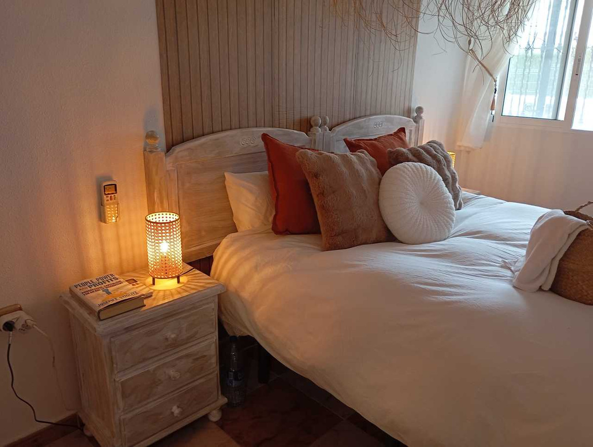 This beautiful property will be sold fully furnished with recent updates, such as a bright living/dining room (renovated in 2023), a separate kitchen with back patio, two Ibiza-style bedrooms, two en-suite bathrooms, air conditioning, a south facing front terrace with veranda.