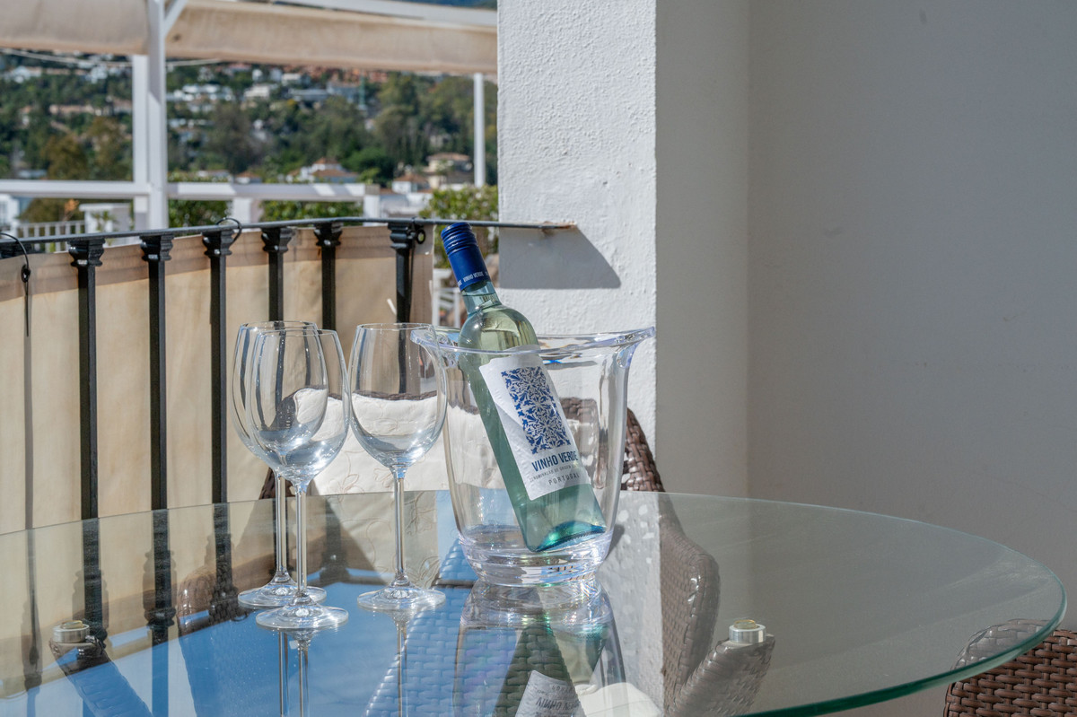 Upstairs, the master suite offers its own generous bathroom and steps out onto a fully private uncovered terrace. The elevated position here noticeably amplifies the already beautiful panoramic views. From here, a staircase leads to the crown of the home: a 30 m² rooftop solarium with far-reaching panoramic views over the Nueva Andalucía golf valley and mountains, a space made for sundowners and long Mediterranean evenings.