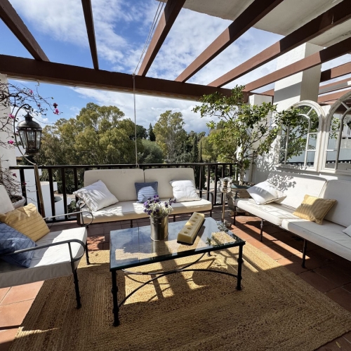 Excellent, three-bedroom apartment, located in the beachfront community of Las Cañas Beach on Marbella's prestigious Golden Mile. The development offers direct access to the beach, 24-hour security, several communal swimming pools, and beautifully maintained tropical gardens, all just a short walk from a variety of bars, shops, and restaurants, while Casablanca Beach—one of the finest on the coast—is right on the doorstep. The apartment features a spacious open-plan living and dining area that leads out to a large private terrace with sea views, a fully fitted kitchen, a master suite with direct terrace access plus two guest bedrooms and bathroom. Additional features include hot and cold air conditioning, fitted wardrobes, and an underground parking space.
