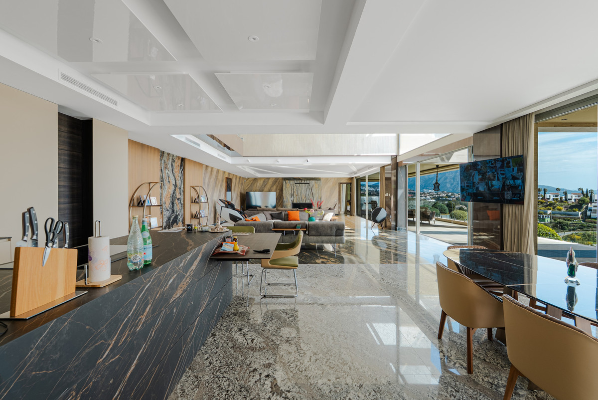 The villa features expansive open-plan interiors where living, dining, and kitchen areas flow seamlessly into one another. Floor-to-ceiling sliding glass doors flood the interiors with natural light while providing direct access to the outdoor terraces.