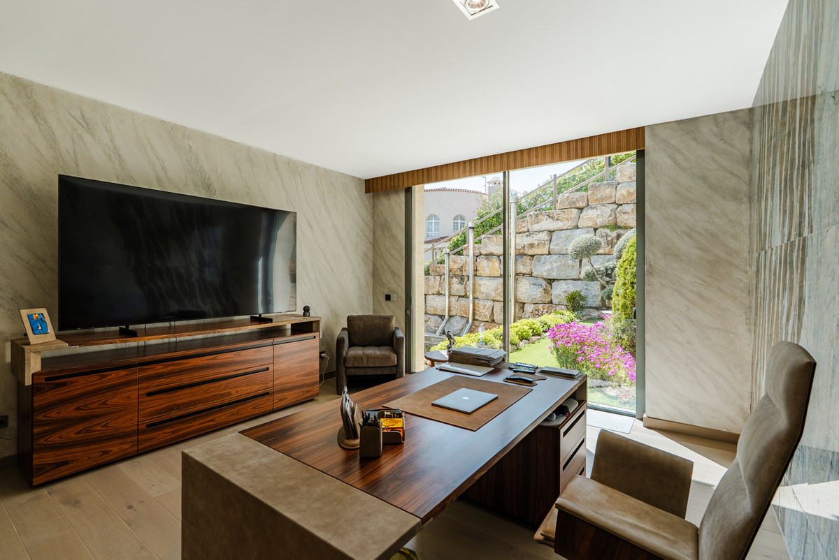 The villa is defined by its exceptional use of premium natural materials. Large-format marble and onyx surfaces create a distinctive and luxurious aesthetic throughout the property.