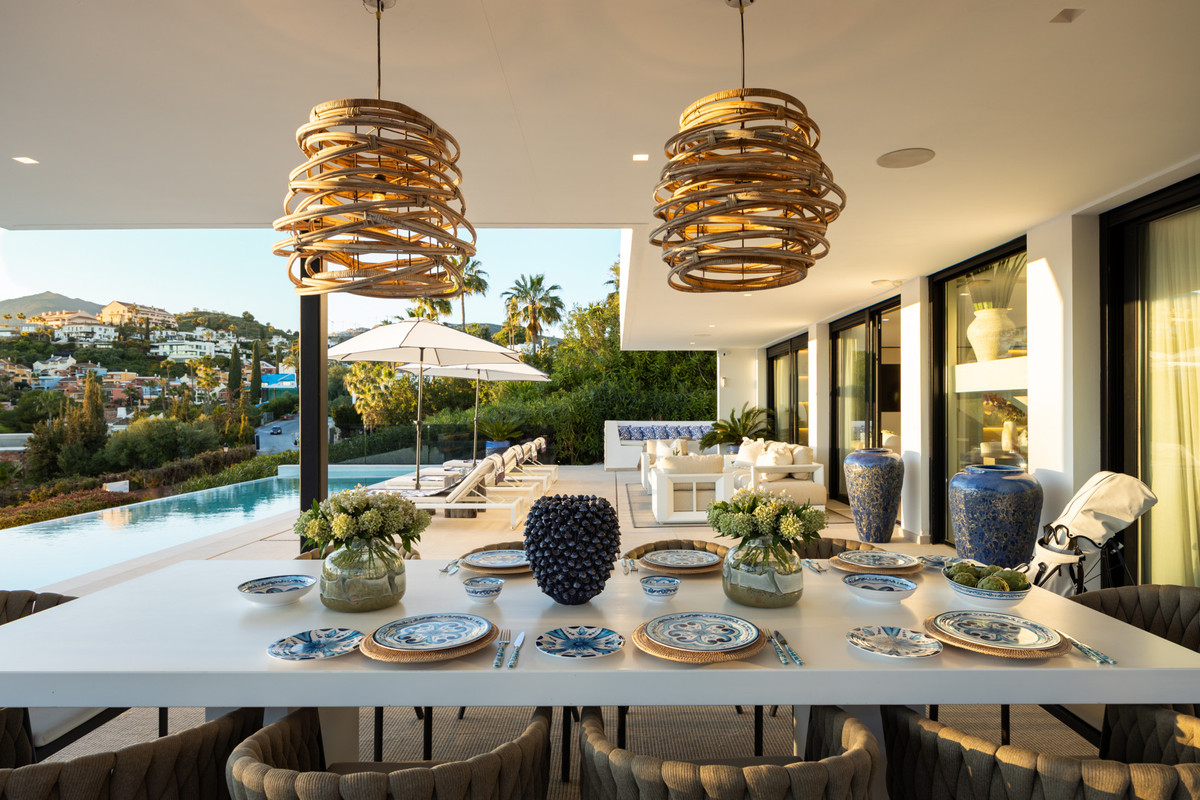 Expansive terraces open onto an infinity pool and elegant outdoor living areas, designed for effortless entertaining against a backdrop of greenery. Inside, floor-to-ceiling windows bathe the interiors in natural light, enhancing the seamless flow between refined living spaces and the outdoors. The open-plan kitchen, appointed with premium Miele appliances, combines sleek design with everyday functionality.