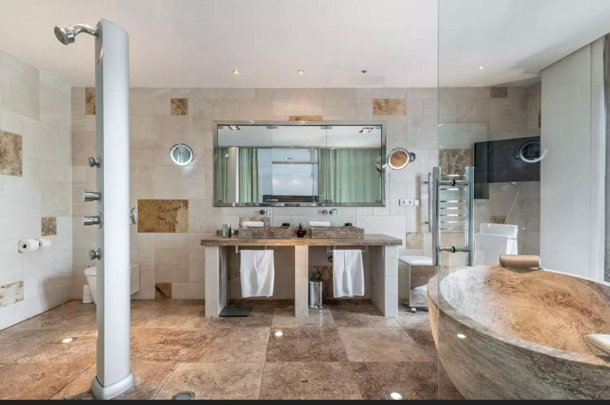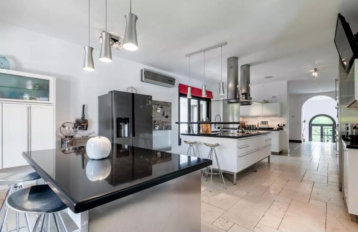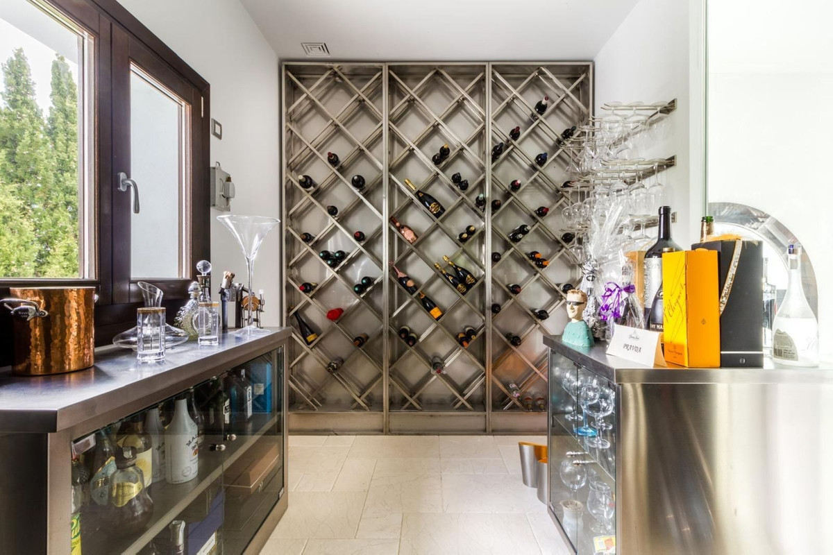 Built with high-quality materials, the property includes Tino marble, Iroko wood flooring, a fully equipped Miele kitchen, and designer staircases and entrance doors created by artist Sebastián Fisher. The villa is equipped with underfloor heating throughout, individual air conditioning, and a SONOS sound system.