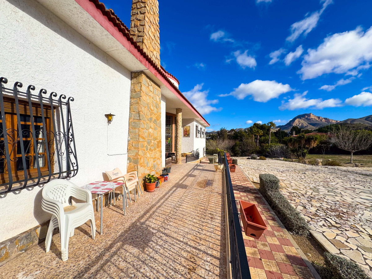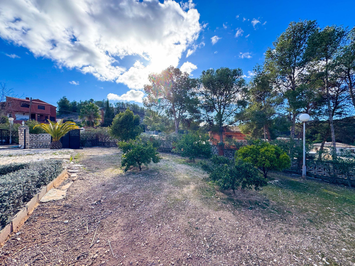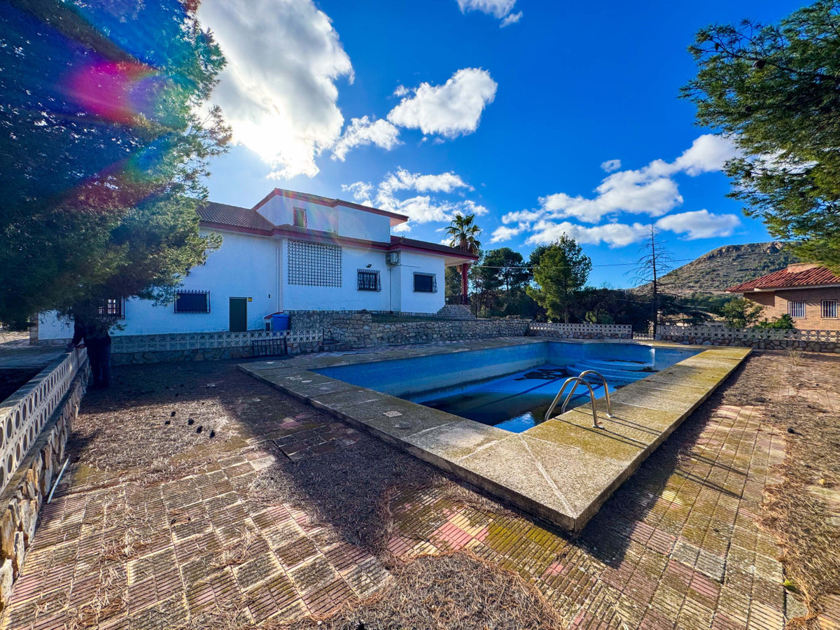 Spacious Mediterranean villa located between the prestigious residential areas of Las Salinetas and Loma Bada, Elda/Petrer, with 5 bedrooms, private pool and beautiful open views of the mountains, situated just 1 km from the center of Elda and about 20 minutes from Alicante and its beaches. A unique property that combines space, privacy, and nature with excellent connections and proximity to all services.The estate is situated on a unique plot of approximately 5,200 m², a type of land that is hard to find nowadays as building homes of this size is not allowed in the area. The plot is distributed on different levels and offers a garden, large terraces, private orchard, a pleasant pine grove with approximately 60 pine trees that provides natural shade and privacy, as well as a small football field ideal for family leisure. It also has two water outlets to facilitate external maintenance.Outside stands out a large pool of 14x7 m, landscaped areas, a covered carport with capacity for up to four vehicles, and a charming barbecue area perfect for outdoor gatherings. The lower level houses auxiliary spaces such as summer kitchen, cellar, storage, external bathroom, and various storage areas.The main house, approximately 350 m², offers a spacious and bright layout, with all rooms facing outside and a privileged orientation. The interior features a stately entrance hall with an elegant curved solid wood staircase and marble steps, a large living room, dining room with fireplace, and a lounge area ideal for family and social gatherings. It also has an independent kitchen with direct access to the semi-basement and multiple storage spaces.The house has five bedrooms, one of them en suite, all with built-in wardrobes and wooden doors that provide warmth and character, in addition to several additional bathrooms that complete the home. On the upper floor, there is a living area, an additional bedroom with a full bathroom, and access to a solarium of approximately 30 m² with open views.The property requires renovation and offers great possibilities for updating and customization, although it is currently ready to move in. It has electricity, water, and septic tank, and being located on urban land presents multiple options for improvement and adaptation.Its location is excellent, with quick access to the A-31 highway in a few minutes, just 5 minutes from all local services, 1 km from the center of Elda, and about 15 minutes from the prestigious La Alenda Golf Club.Do not hesitate to contact us for more information or to schedule a visit.