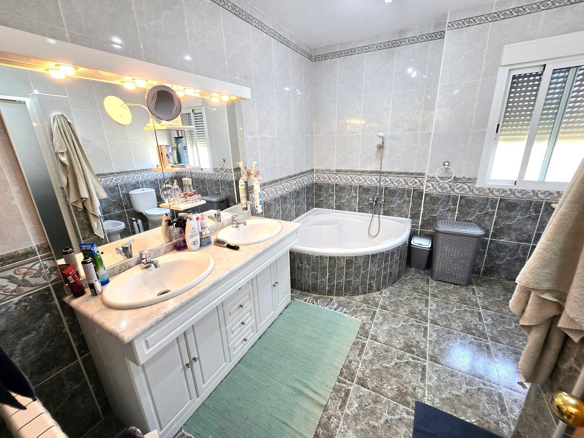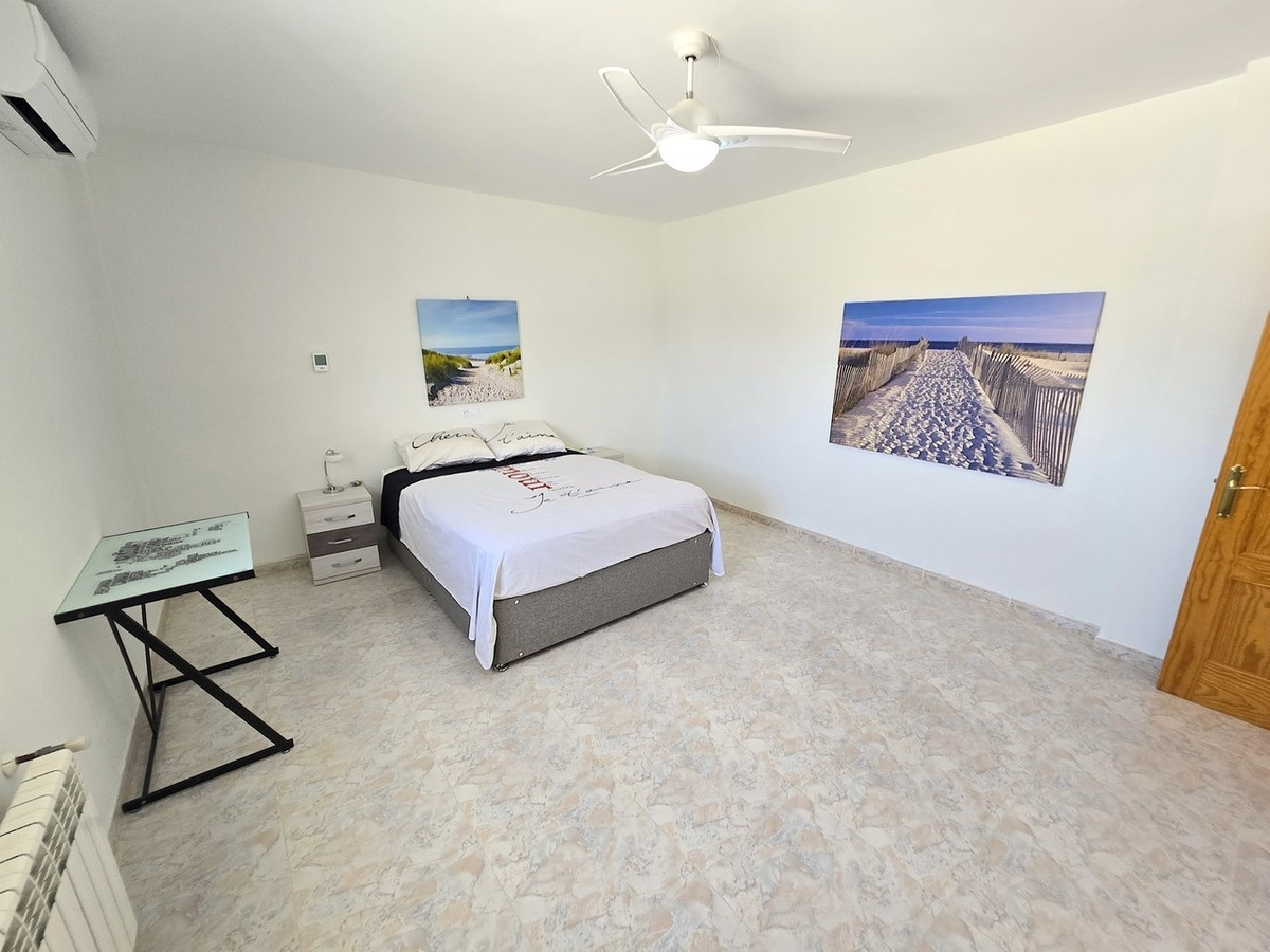 The first of these bedrooms is a good size with views over the pool area. It has a ceiling light with a fan for climate control. The en-suite bathroom, has a shower cubicle, W.C, hand basin and vanity mirror. The bathroom is tiled for easy maintenance.