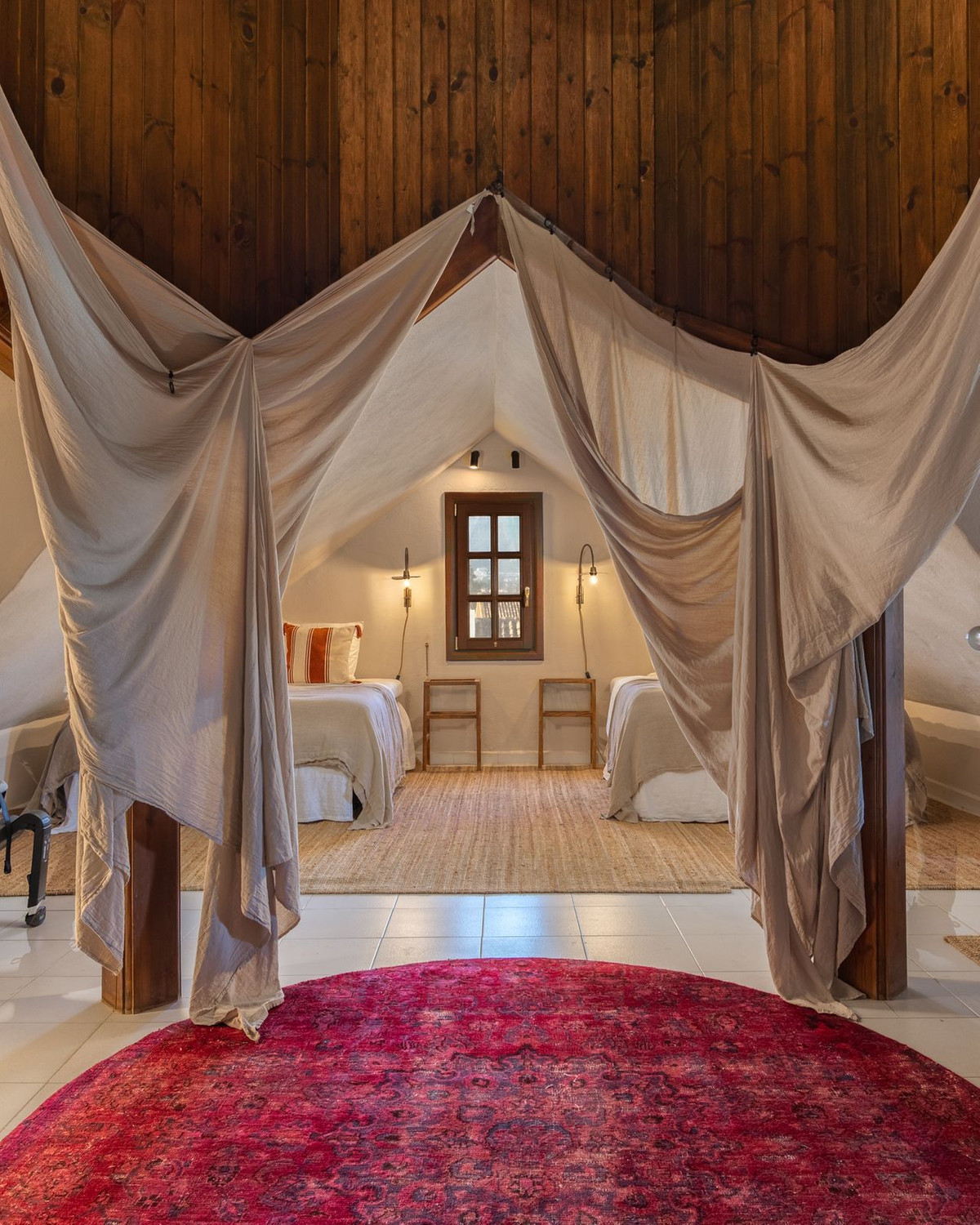 The second floor, connected by an open-plan staircase, seamlessly blends with the level below, where striking double-height ceilings enhance the sense of space and invite an abundance of natural light. On this level, a fourth en-suite bedroom is complemented by a converted attic of approximately 50 m². The T-shaped layout creates two additional sleeping areas along with a substantial walk-in closet. The angled ceilings introduce charm and a cosy, intimate feel.