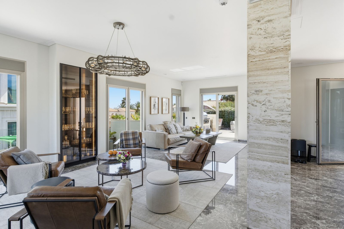 Set on a private gated plot of 665 m², the property offers 442 m² of living space across multiple levels, including six spacious bedrooms and four designer bathrooms.