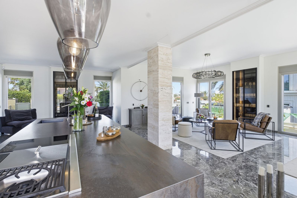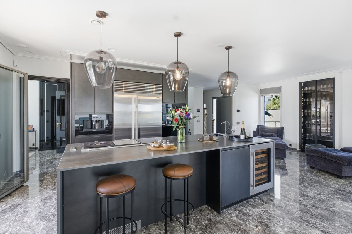 The open-plan living area is flooded with natural light through floor-to-ceiling windows and features a statement fireplace and a spectacular custom-designed luxury kitchen. Every detail has been carefully selected to create a seamless blend of elegance and functionality.