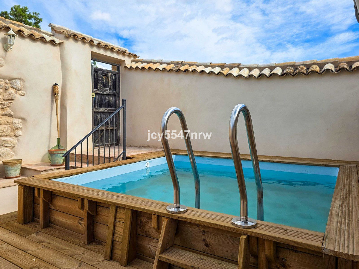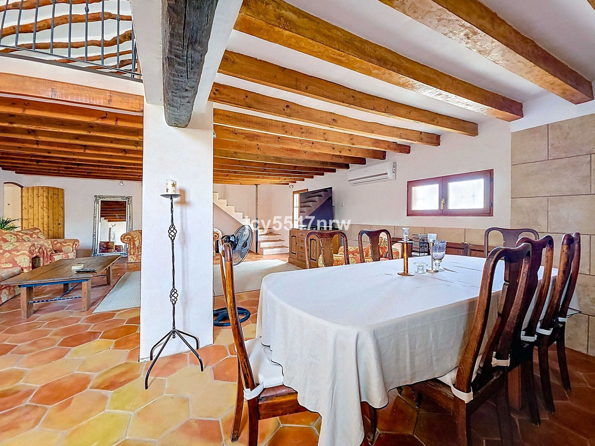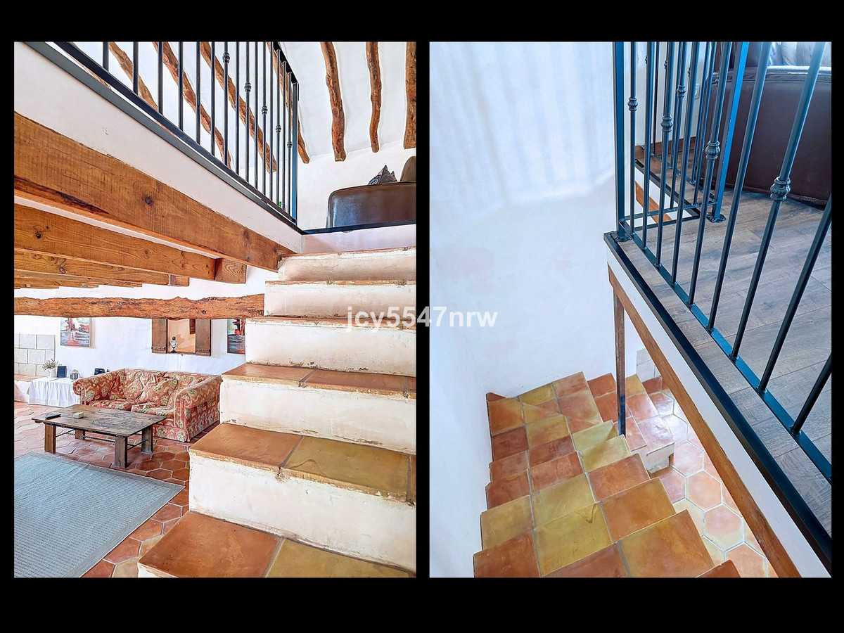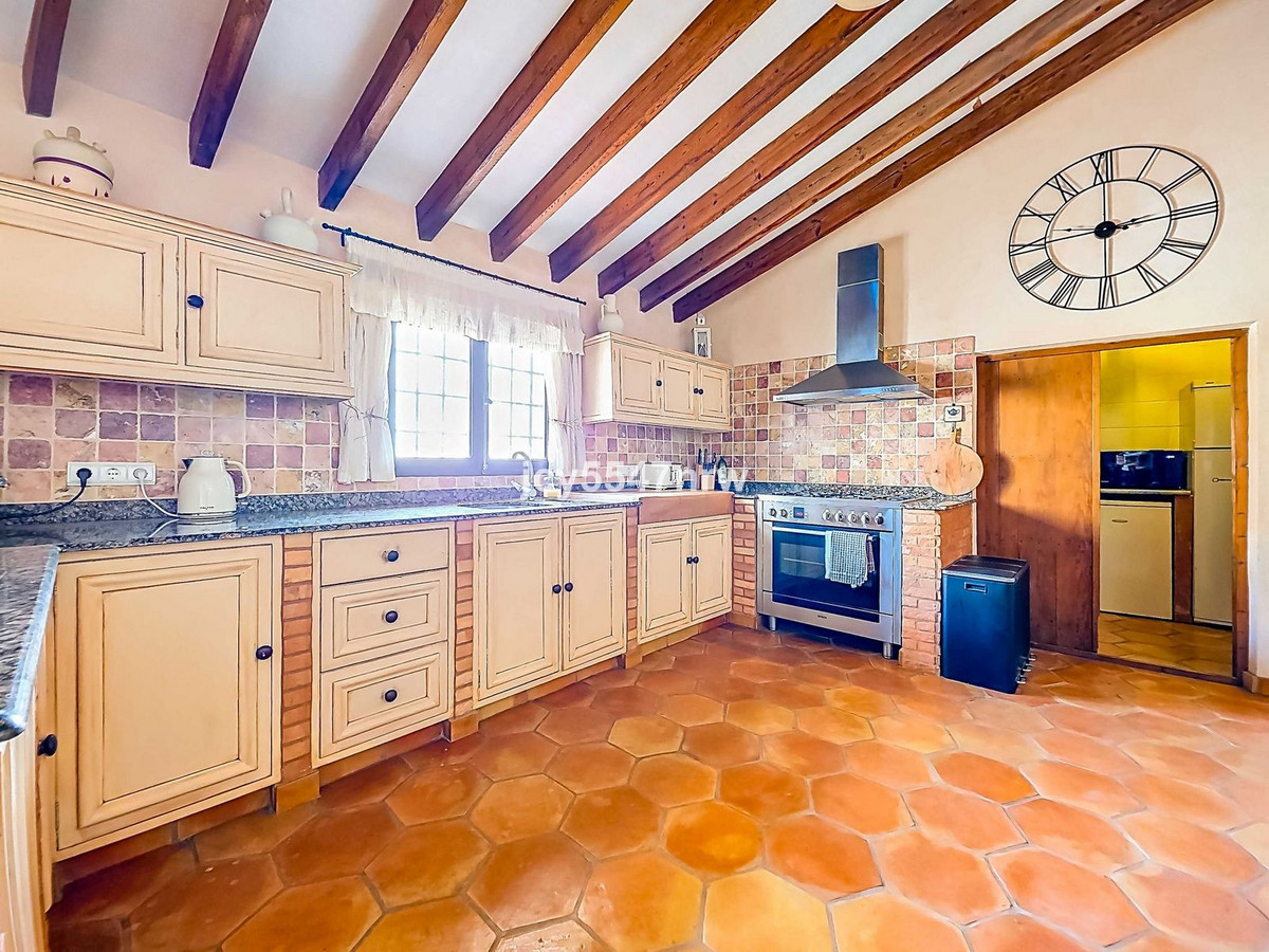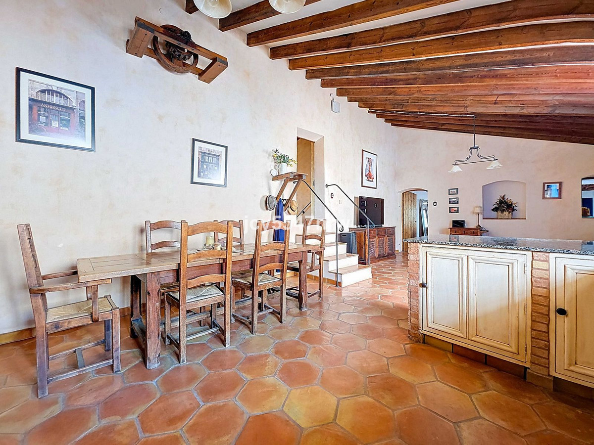 From the sitting area, there is access to both an upper and lower part of the house. The upper level houses a large family kitchen with a pantry and wood-burning stove, as well as access to the recently created outdoor area with a plunge pool — the perfect spot to enjoy the Spanish sun in complete privacy.