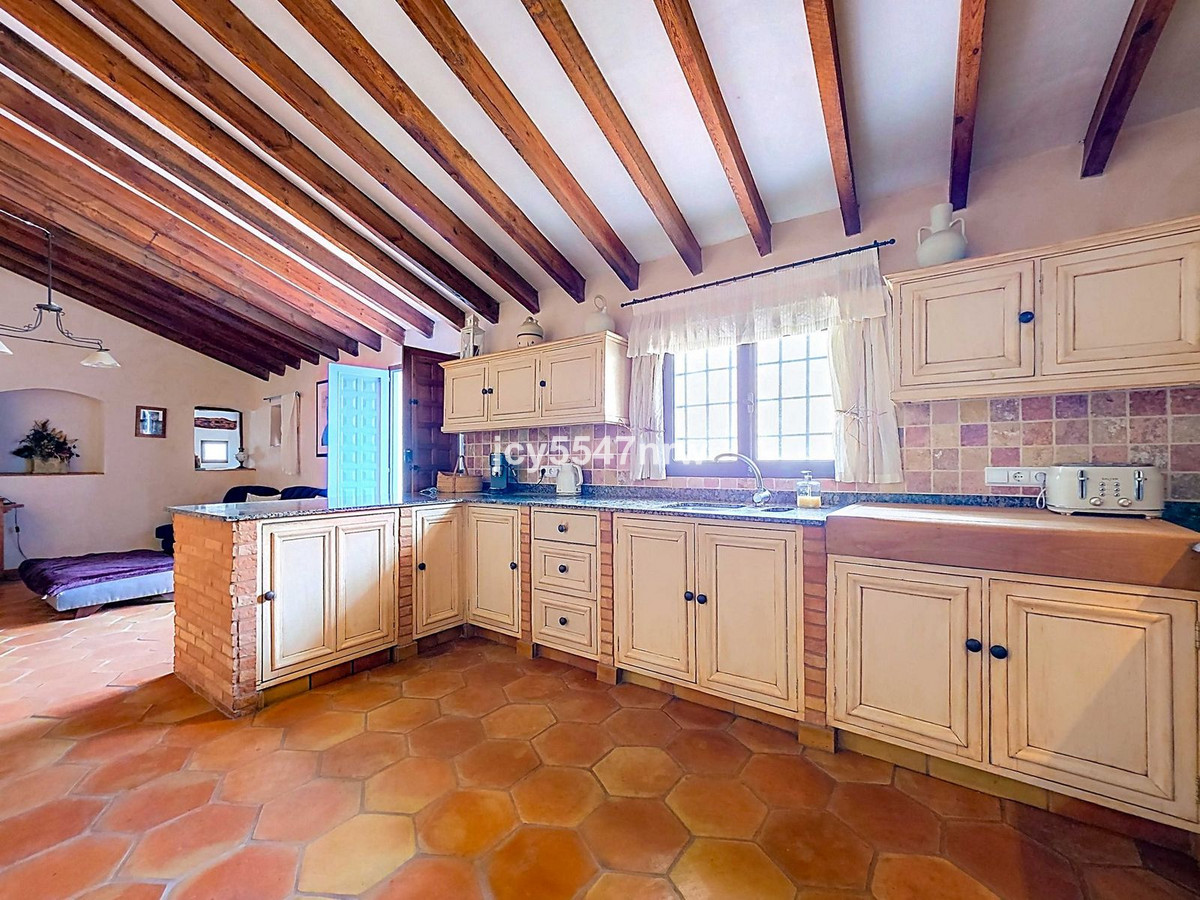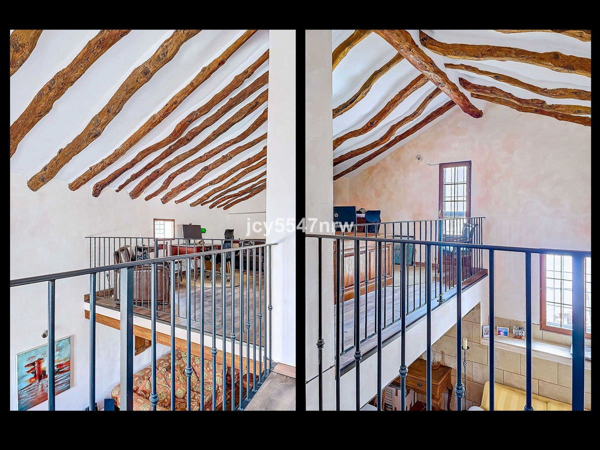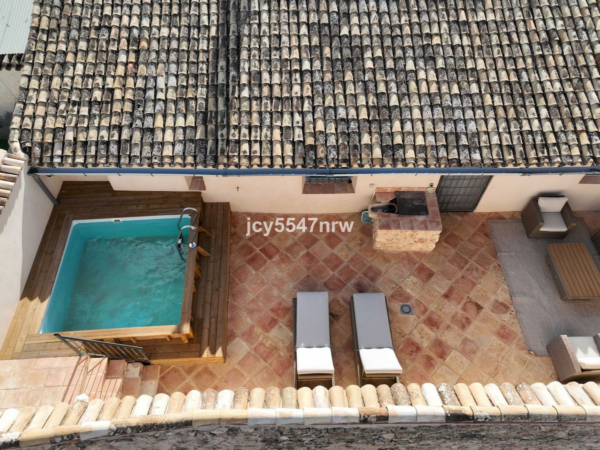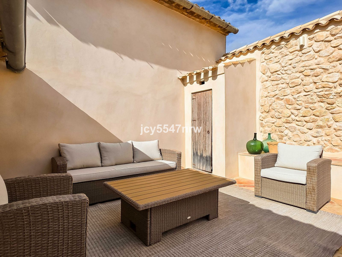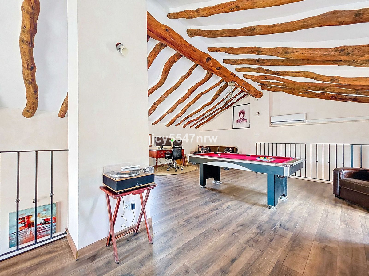From the sitting area, there is access to both an upper and lower part of the house. The upper level houses a large family kitchen with a pantry and wood-burning stove, as well as access to the recently created outdoor area with a plunge pool — the perfect spot to enjoy the Spanish sun in complete privacy.