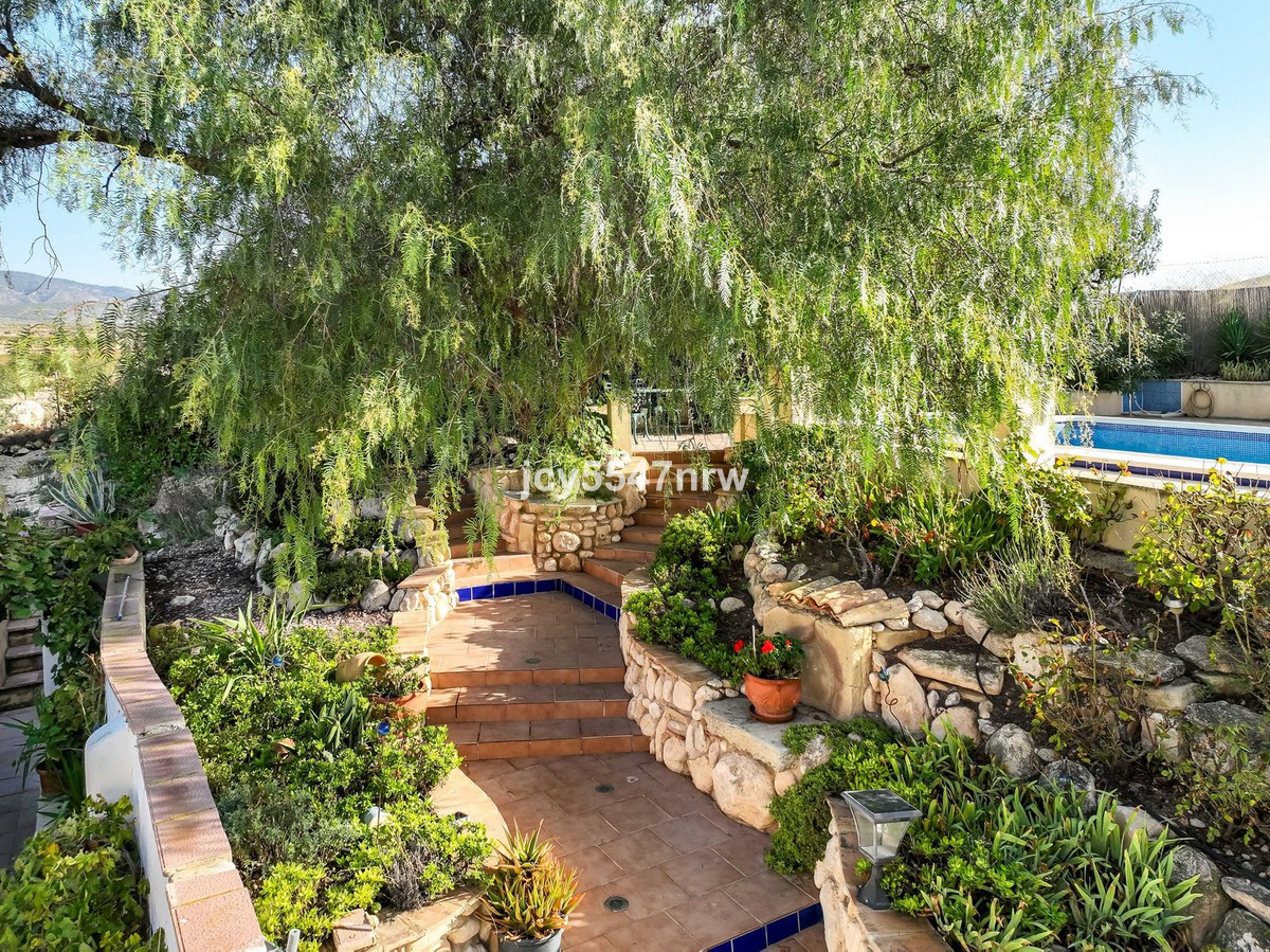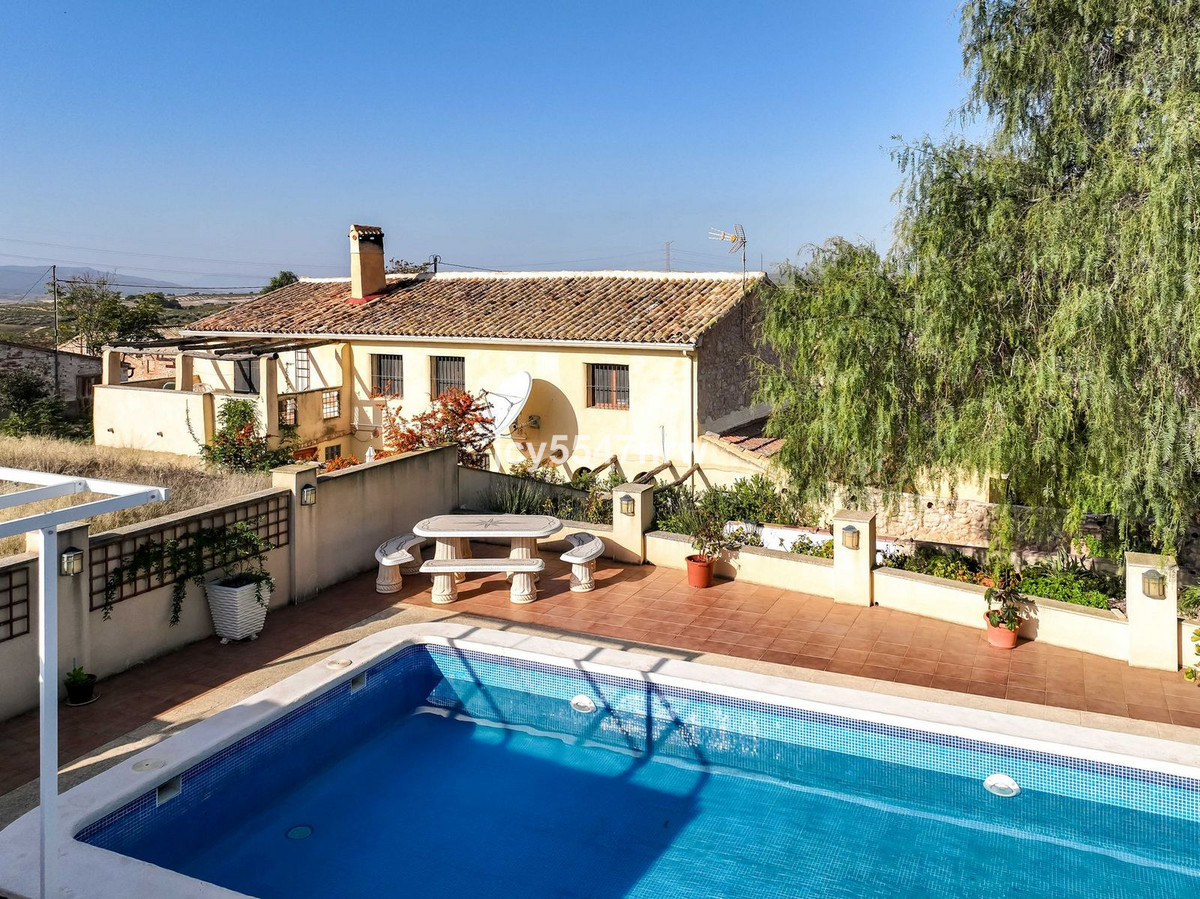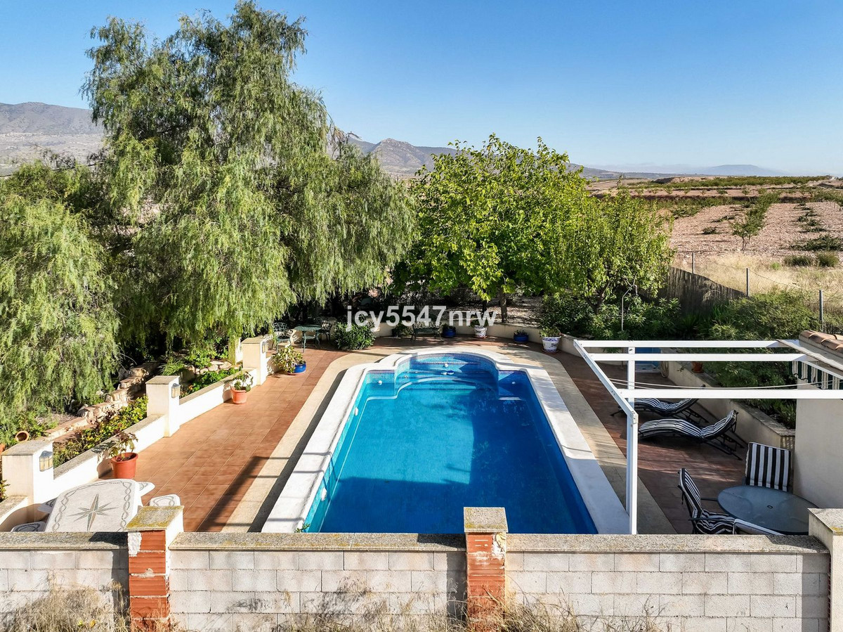 This charming country house is spread over two floors and features cosy patios that flow into a beautifully landscaped garden with a swimming pool. It also includes two garages. The property is peacefully located in a small hamlet between Pinoso and Jumilla, surrounded by stunning countryside and panoramic views.