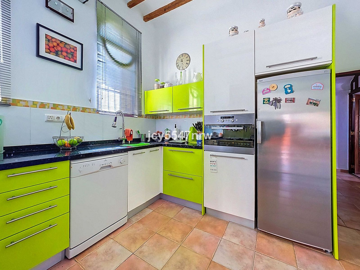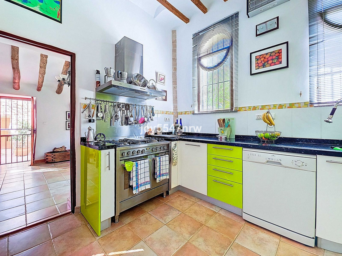 On the other side of the ground floor, you'll find the spacious kitchen, and behind it, a charming dining room. From the dining room, there is access to a storage/laundry room, a separate toilet, and the patios, which open onto the lovely garden.