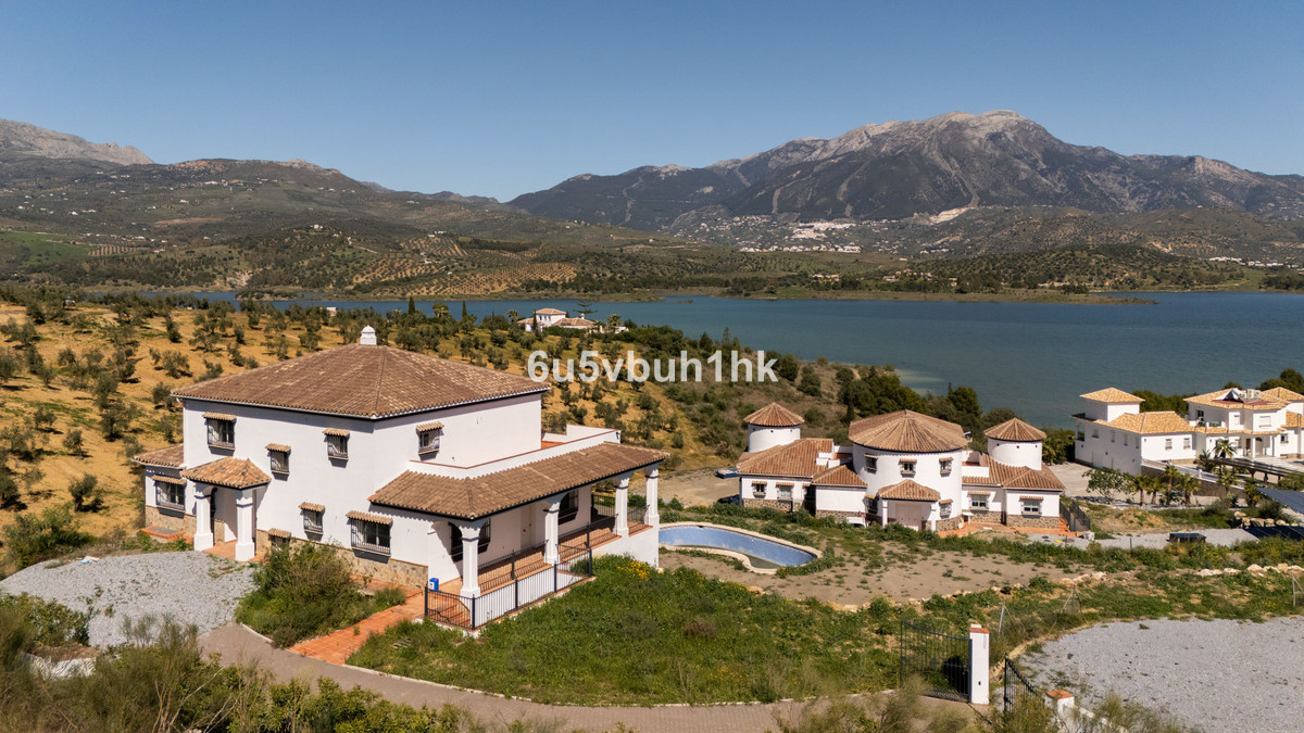 An Andalucian-style villa with a modern soul, elevated above the shores of Embalse de la Viñuela — Málaga's largest reservoir — with uninterrupted water and mountain views in every direction. 400 m² of interior space. A fenced 4,230 m² plot. Six bedrooms, five bathrooms, multiple terraces, a pool, a large garage, and a fully independent guest apartment. The proportions are generous. The setting is quietly extraordinary.