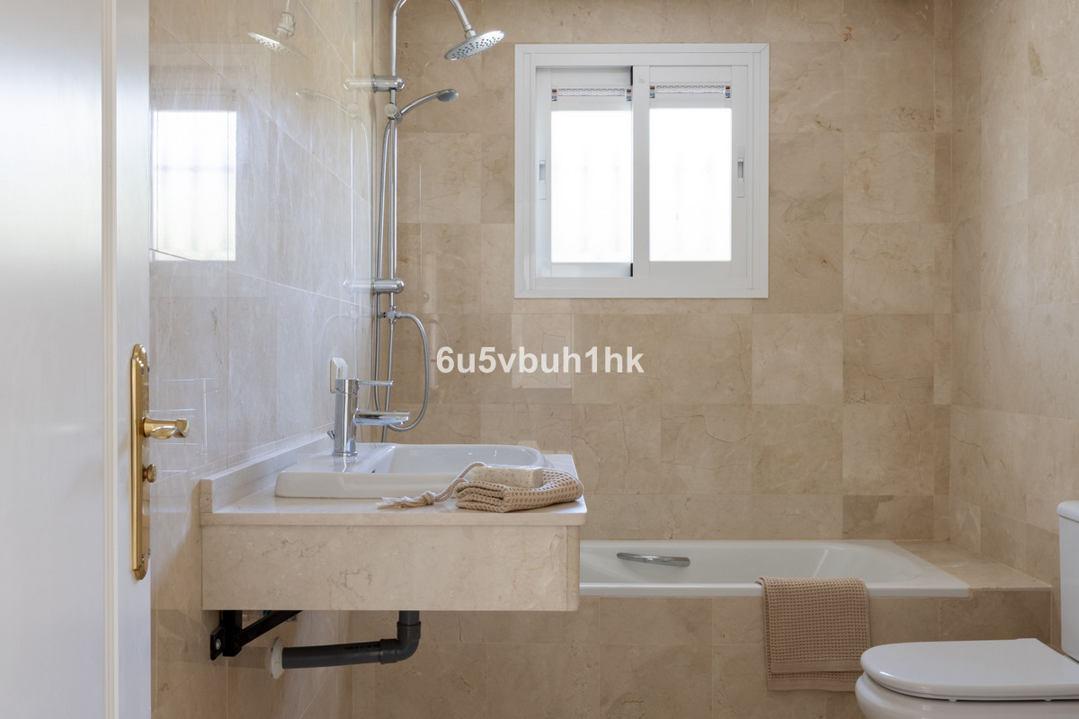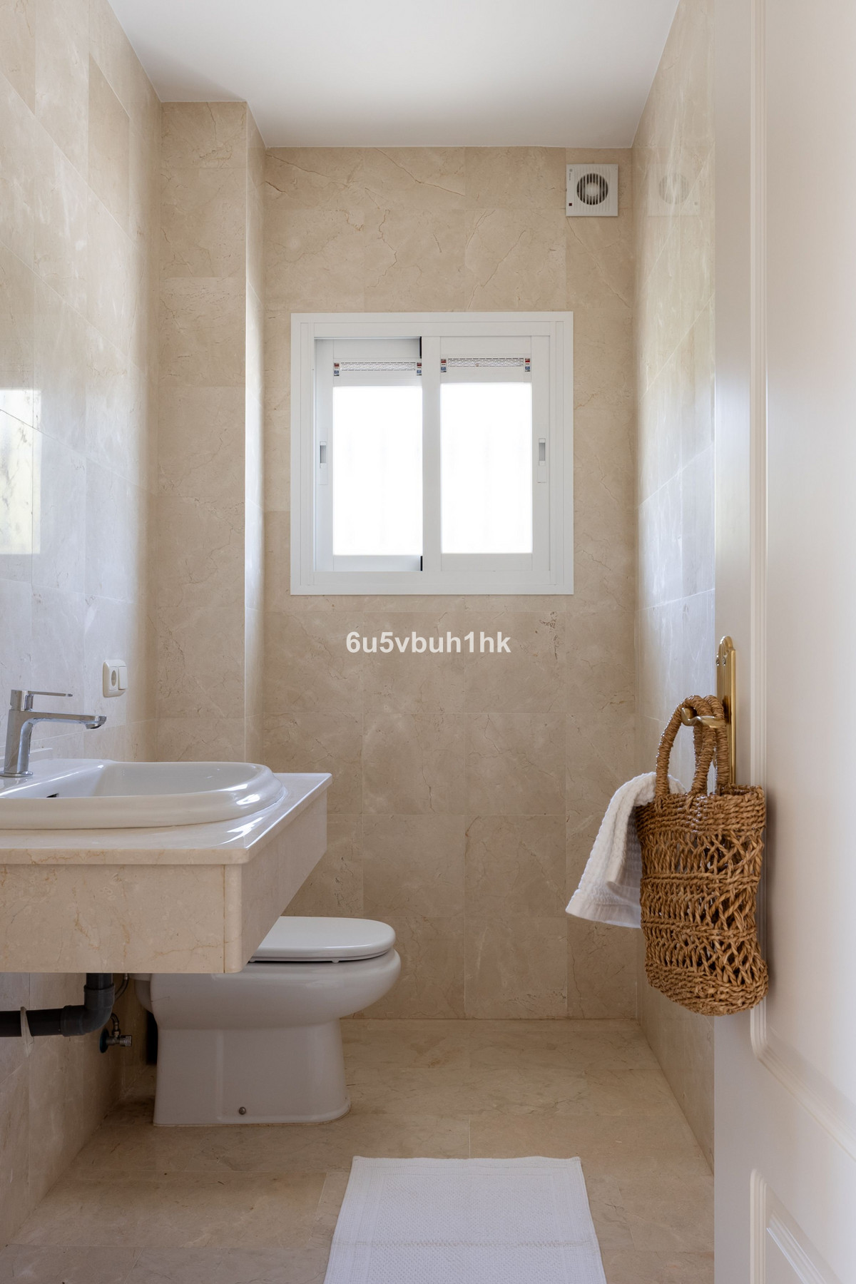 The top floor belongs entirely to the principal suite — less a bedroom, more a private world. Large en-suite with shower and jacuzzi. A substantial terrace looking straight out over the pool, the gardens, the lake, and La Maroma beyond. Nothing to interrupt it. Nothing ever will.