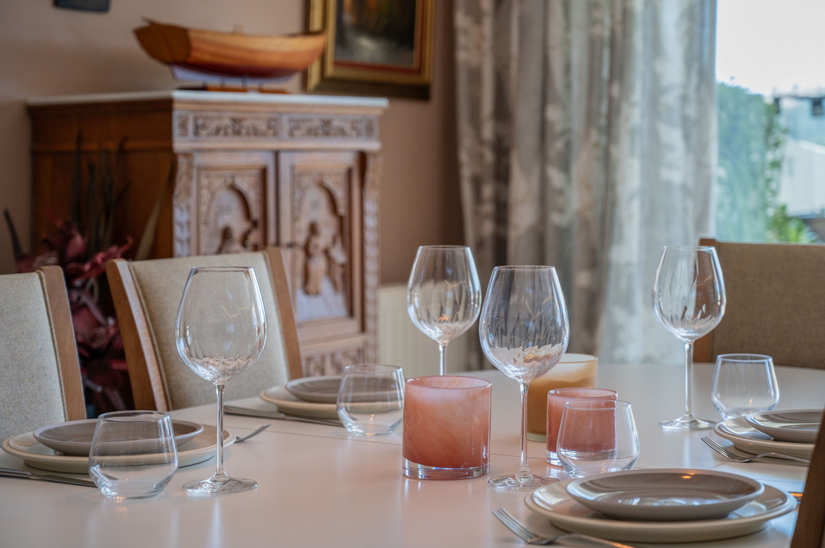 The property has been completely renovated to a high standard and offers a thoughtful layout across one level. Upon entering, you are welcomed by a spacious hallway. To the right, there is a large utility and laundry room with excellent storage. To the left, a beautifully designed Scandinavian-style kitchen features a central island with integrated cooking area, allowing you to enjoy the views while entertaining guests.