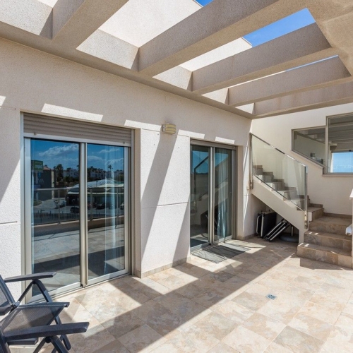 Welcome to this extraordinary duplex penthouse apartment, located in the heart of the prestigious Muna Spa & Resort in Los Dolses. Designed for an unmatched lifestyle, this home features five terraces and balconies facing both sunlit and shaded directions, making it a true retreat. With breathtaking sea views from every room and a seamless blend of modern design and premium amenities, this property is perfect for those seeking something truly special. This thoughtfully crafted home, built by one of the most renowned builders on the Costa, includes an open-plan living area that connects a bright and inviting lounge with a fully equipped modern kitchen. The kitchen features sleek finishes, clever storage solutions, and stylish wooden shutters, while an adjacent utility room provides additional functionality with space for a washing machine and water heater. The apartment boasts three generously sized bedrooms, all with built-in wardrobes. The master bedroom and one other bedroom open directly onto private terraces or balconies, perfect for unwinding in peace. Two elegant bathrooms, one en-suite, are beautifully designed with contemporary earthy tones, adding a touch of sophistication. Step out from the living room onto a spacious terrace complete with an awning, providing a cool escape on hot days. The upper level offers another terrace featuring an outdoor kitchen, barbecue, and dining area – ideal for hosting meals while soaking in the stunning views.The standout feature of this stunning penthouse is the expansive roof terrace. Here, you can relax in the jacuzzi, lounge in the seating area, or sunbathe in privacy while enjoying panoramic sea views. This space is perfect for summer evenings, alfresco dining and entertaining. Located at the stunning Muna Spa & Resort, built to an exceptionally high standard by one of the most renowned builders on the Costa with stunning communal areas including an impressive communal pool, indoor heated pool, sauna , gym and immaculate landscaped gardensSituated within walking distance of restaurants, shops, and supermarkets, the apartment offers unparalleled convenience. Walking to the local amenities of the commercial area of Los Dolses, plus the renowned La Zenia Boulevard shopping centre, with its vast array of stores and entertainment options, is just minutes away, while stunning beaches and top-tier golf courses are a short drive from your doorstep. Contact us today for your viewing