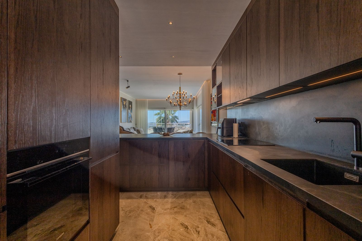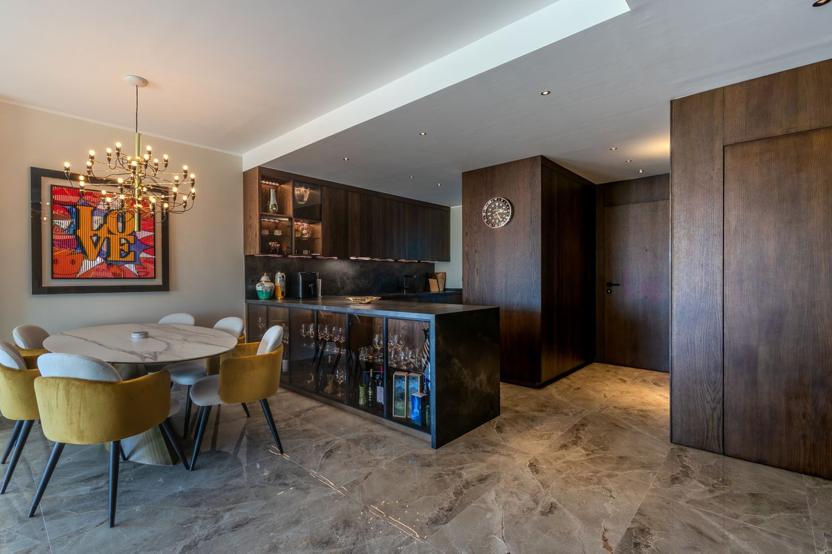 The spacious living area opens onto a generous covered terrace, part of which has been glass-enclosed to create an extended living space—perfect for enjoying the stunning views of the mountains, the sea, and the port of Fuengirola all year round.