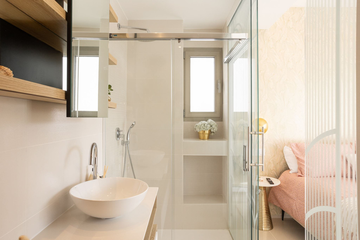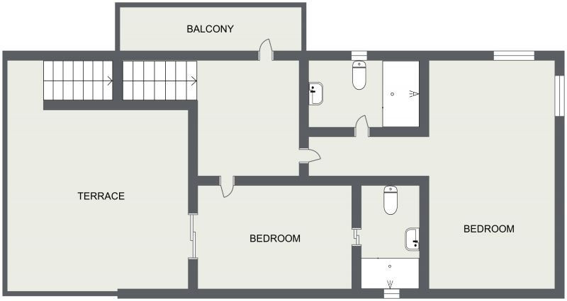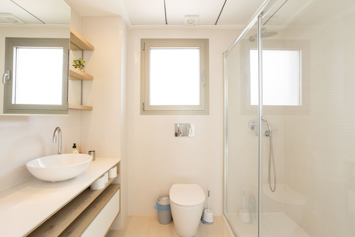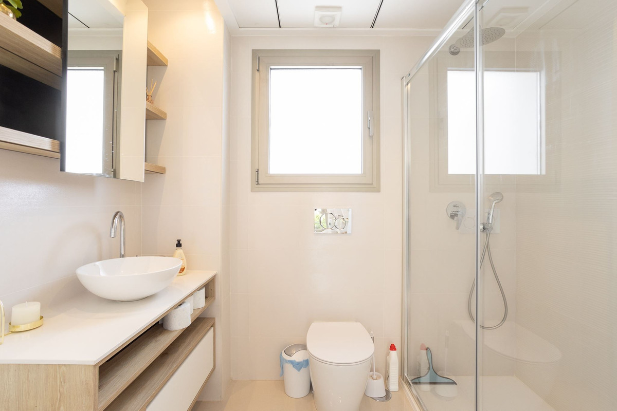The three bathrooms are equipped with a toilet, sink and shower.