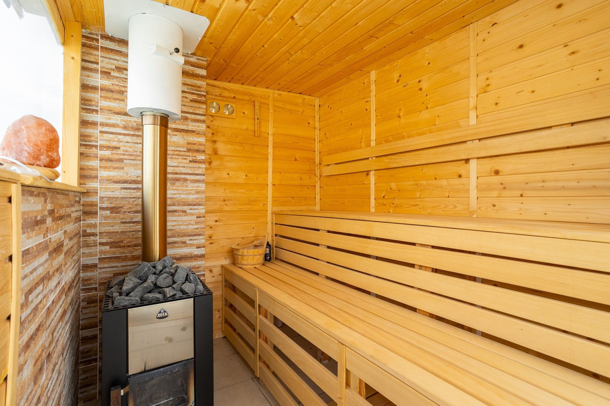 The living room and kitchen are located in an open plan and there is plenty of space for a lounge area with a sofa and TV stand, as well as a dining area for four to six people.