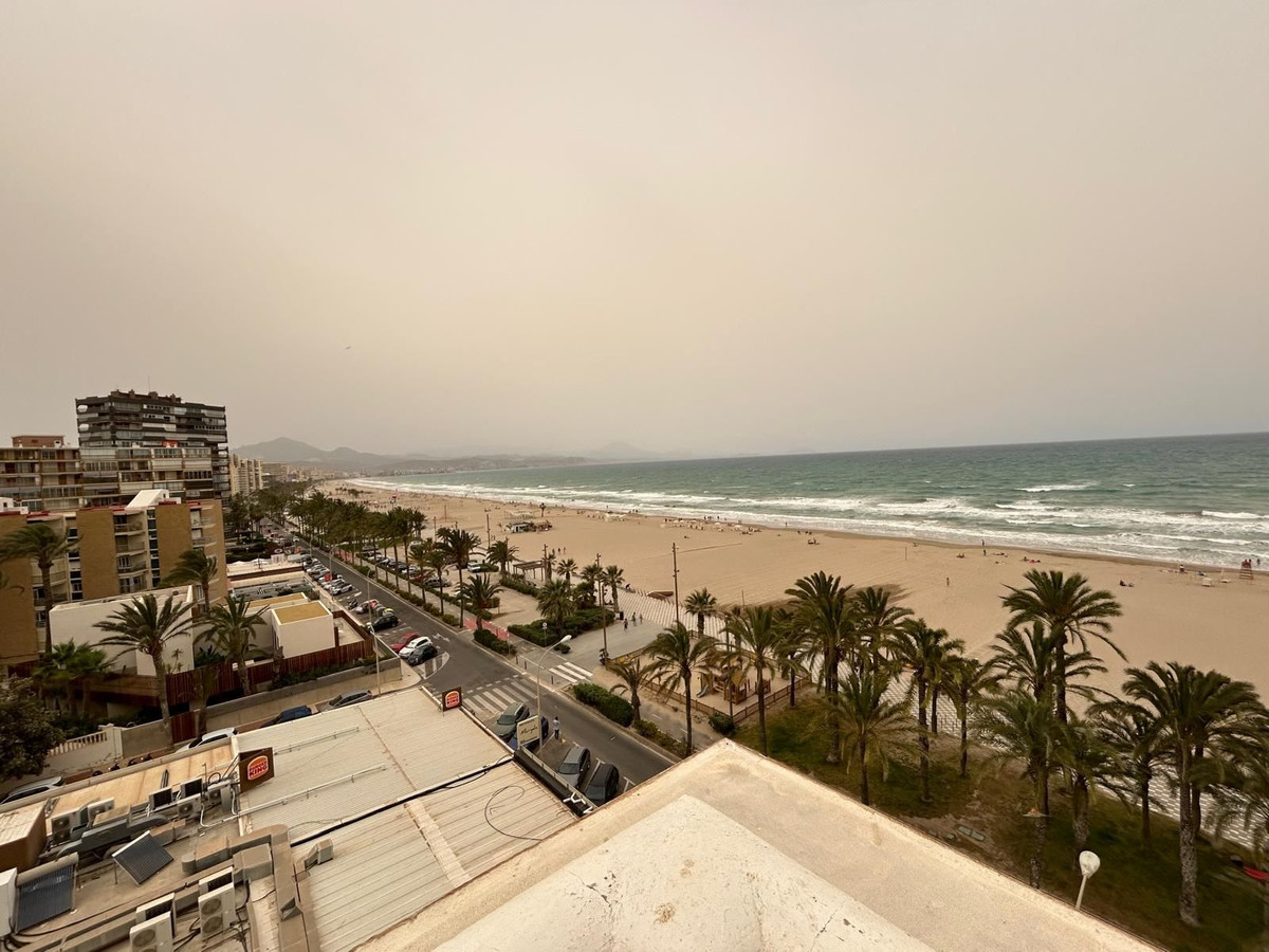 The apartment and balcony offer views of the shared pool area, Playa de San Juan and the Mediterranean Sea.