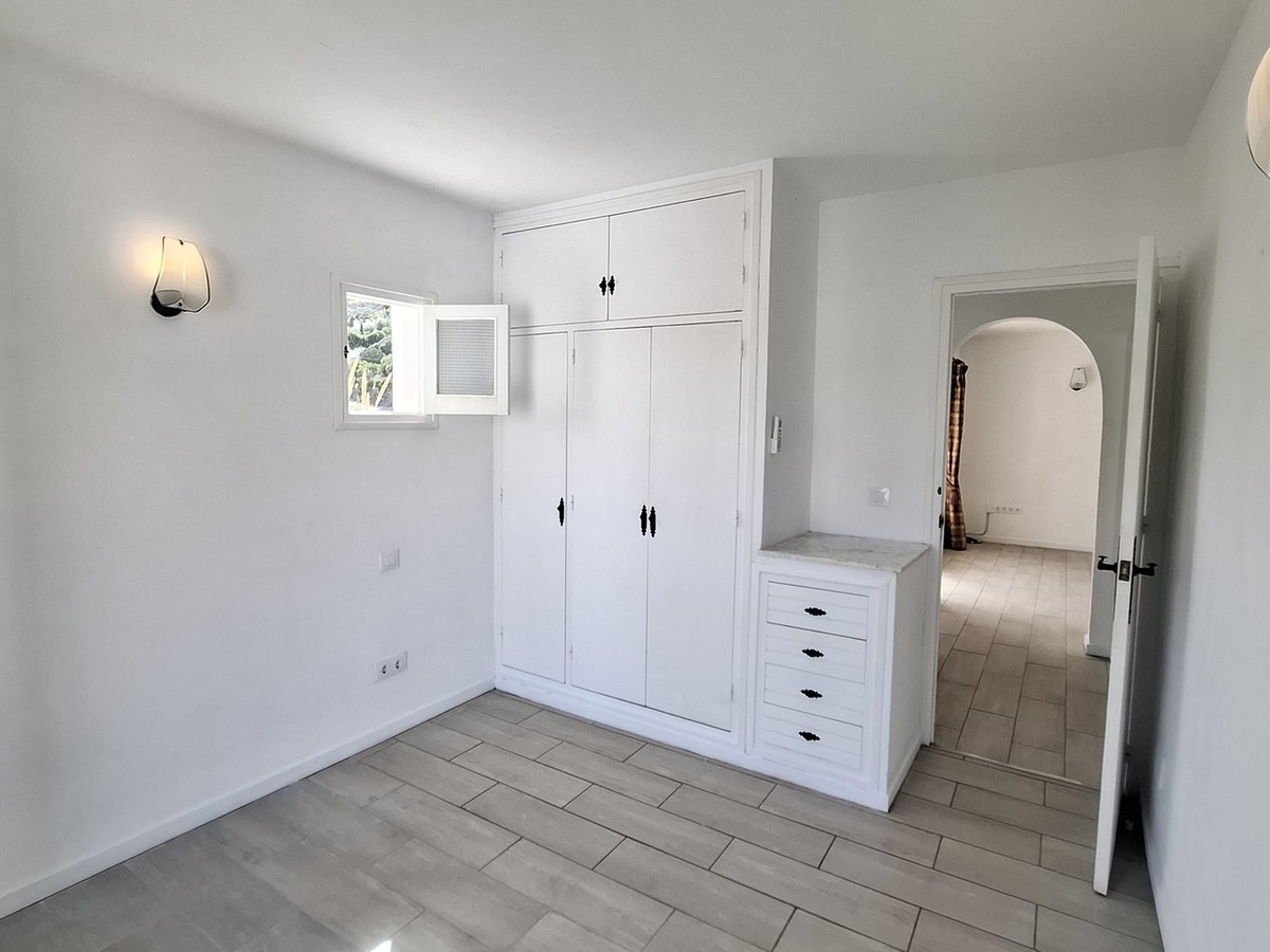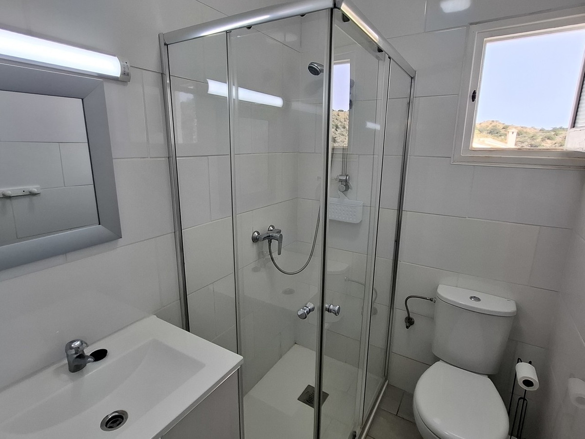 An archway from the lounge leads to a small corridor where both bedrooms and the family bathroom are located. The principal bedroom is bright and airy, with dual hot and cold air conditioning, built-in storage and a modernised en-suite bathroom featuring a walk-in shower. The second bedroom also includes fitted wardrobes and benefits from double glass and wooden doors that open onto a small balcony, again enjoying the attractive countryside views.