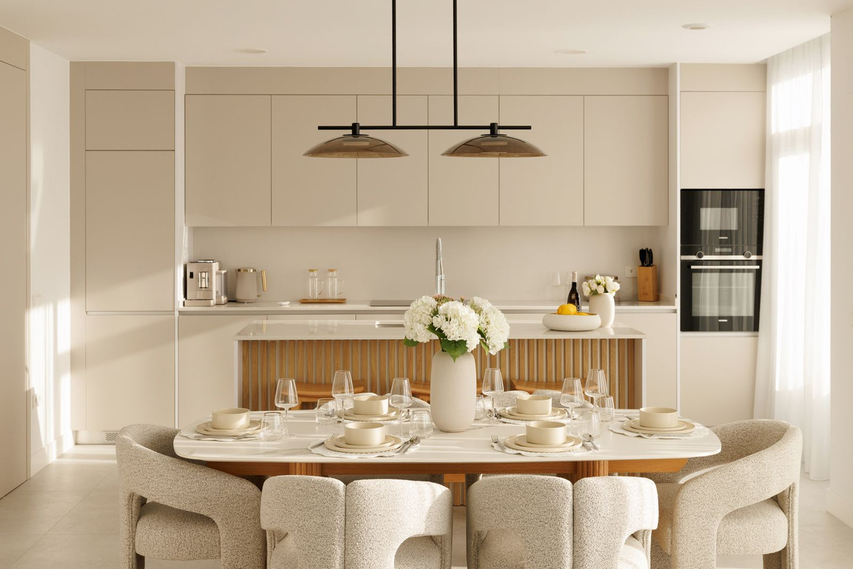 The true highlight of this penthouse is the impressive 128 m² of terraces, designed for both relaxation and entertaining, featuring a private swimming pool, stylish lounge areas, a covered outdoor dining space, and open views over landscaped gardens and modern architecture. The east-facing orientation allows for soft morning light and pleasant temperatures throughout the day, making the outdoor areas enjoyable year-round.